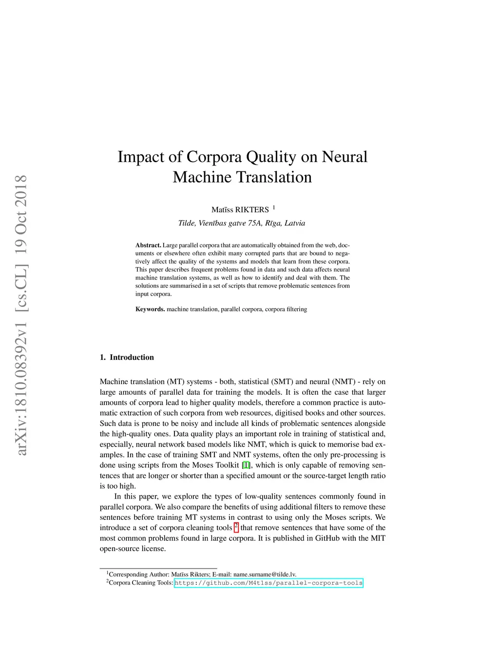 Impact of Corpora Quality on Neural Machine Translation