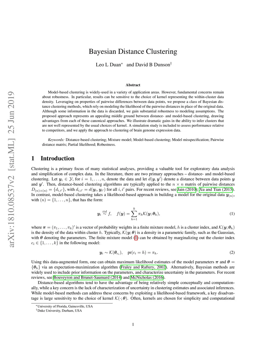 Model-based clustering is widely-used in a variety of application areas. However, fundamental concerns remain about robustness. In particular, results can be sensitive to the choice of kernel representing the within-cluster data density. Leveraging on properties of pairwise differences between data points, we propose a class of Bayesian distance clustering methods, which rely on modeling the likelihood of the pairwise distances in place of the original data. Although some information in the data is discarded, we gain substantial robustness to modeling assumptions. The proposed approach represents an appealing middle ground between distance- and model-based clustering, drawing advantages from each of these canonical approaches. We illustrate dramatic gains in the ability to infer clusters that are not well represented by the usual choices of kernel. A simulation study is included to assess performance relative to competitors, and we apply the approach to clustering of brain genome expression data. Keywords: Distance-based clustering; Mixture model; Model-based clustering; Model misspecification; Pairwise distance matrix; Partial likelihood; Robustness.
