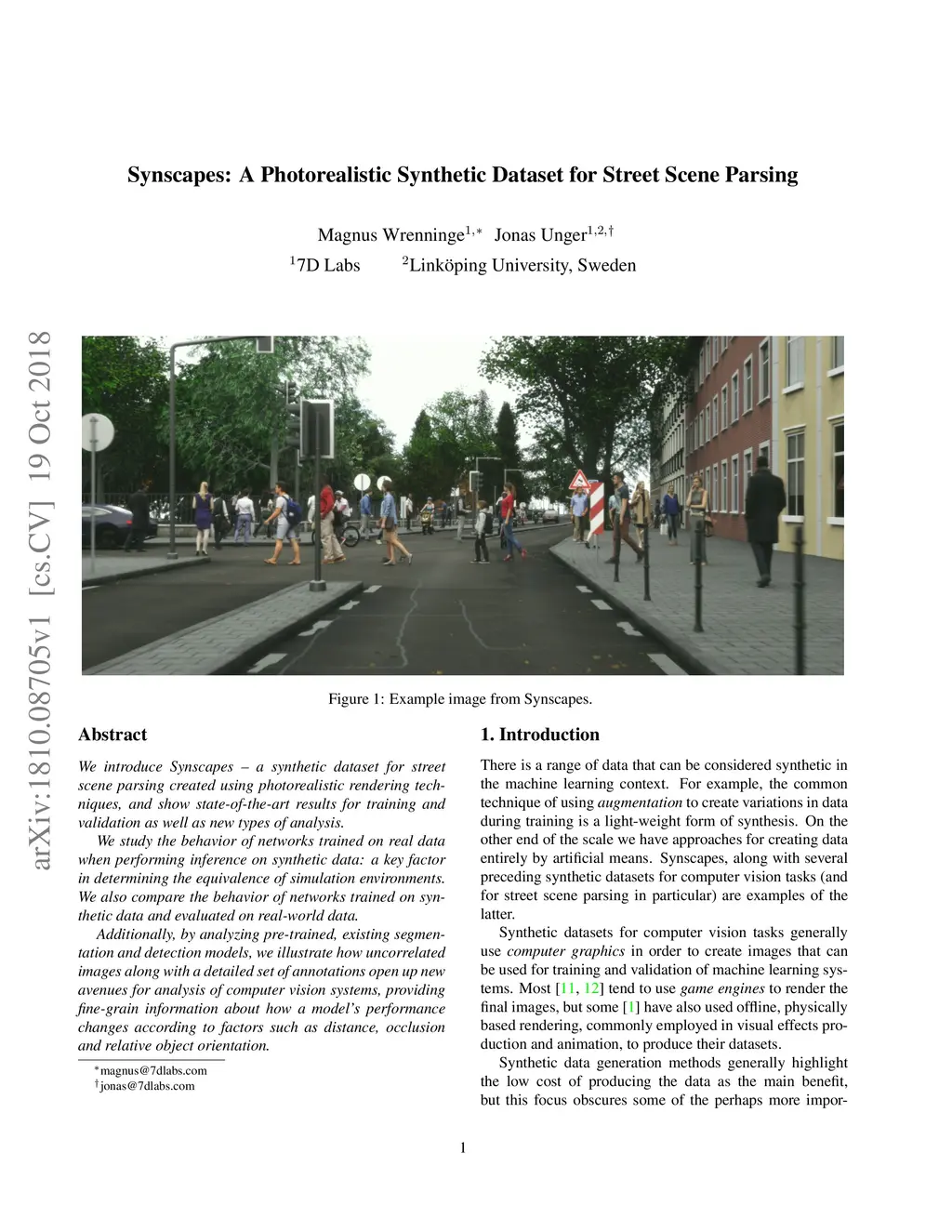 We introduce Synscapes -- a synthetic dataset for street scene parsing created using photorealistic rendering techniques, and show state-of-the-art results for training and validation as well as new types of analysis. We study the behavior of networks trained on real data when performing inference on synthetic data: a key factor in determining the equivalence of simulation environments. We also compare the behavior of networks trained on synthetic data and evaluated on real-world data. Additionally, by analyzing pre-trained, existing segmentation and detection models, we illustrate how uncorrelated images along with a detailed set of annotations open up new avenues for analysis of computer vision systems, providing fine-grain information about how a model's performance changes according to factors such as distance, occlusion and relative object orientation.