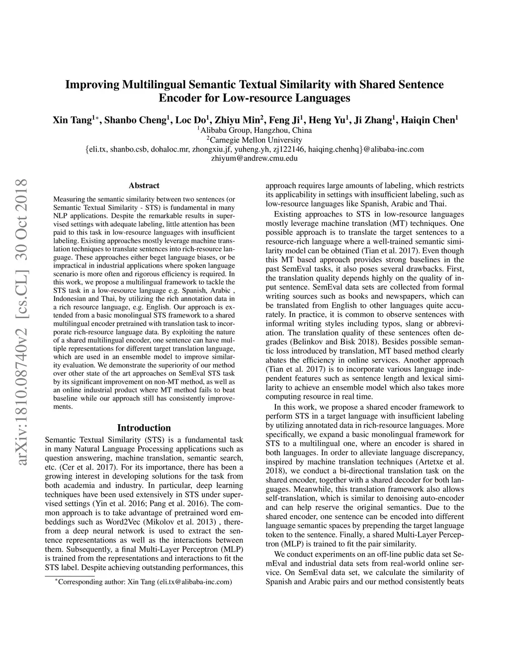 Measuring the semantic similarity between two sentences (or Semantic Textual Similarity - STS) is fundamental in many NLP applications. Despite the remarkable results in supervised settings with adequate labeling, little attention has been paid to this task in low-resource languages with insufficient labeling. Existing approaches mostly leverage machine translation techniques to translate sentences into rich-resource language. These approaches either beget language biases, or be impractical in industrial applications where spoken language scenario is more often and rigorous efficiency is required. In this work, we propose a multilingual framework to tackle the STS task in a low-resource language e.g. Spanish, Arabic , Indonesian and Thai, by utilizing the rich annotation data in a rich resource language, e.g. English. Our approach is extended from a basic monolingual STS framework to a shared multilingual encoder pretrained with translation task to incorporate rich-resource language data. By exploiting the nature of a shared multilingual encoder, one sentence can have multiple representations for different target translation language, which are used in an ensemble model to improve similarity evaluation. We demonstrate the superiority of our method over other state of the art approaches on SemEval STS task by its significant improvement on non-MT method, as well as an online industrial product where MT method fails to beat baseline while our approach still has consistently improvements.