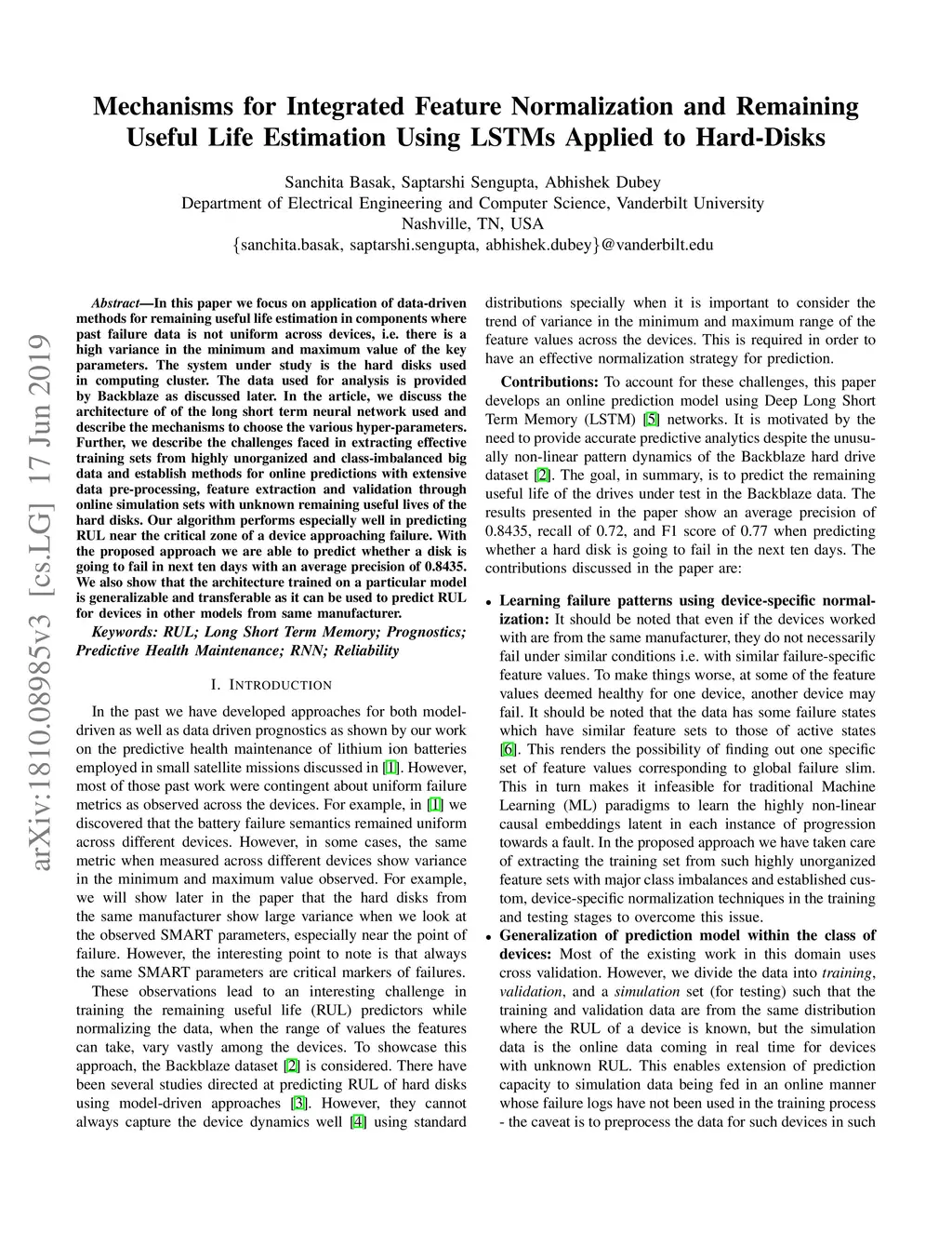 With emerging smart communities, improving overall system availability is becoming a major concern. In order to improve the reliability of the components in a system we propose an inference model to predict Remaining Useful Life (RUL) of those components. In this paper we work with components of backend data servers such as hard disks, that are subject to degradation. A Deep Long-Short Term Memory (LSTM) Network is used as the backbone of this fast, data-driven decision framework and dynamically captures the pattern of the incoming data. In the article, we discuss the architecture of the neural network and describe the mechanisms to choose the various hyper-parameters. Further, we describe the challenges faced in extracting effective training sets from highly unorganized and class-imbalanced big data and establish methods for online predictions with extensive data pre-processing, feature extraction and validation through online simulation sets with unknown remaining useful lives of the hard disks. Our algorithm performs especially well in predicting RUL near the critical zone of a device approaching failure. With the proposed approach we are able to predict whether a disk is going to fail in next ten days with an average precision of 0.8435. We also show that the architecture trained on a particular model can be used to predict RUL for devices in different models from same manufacturer through transfer learning.