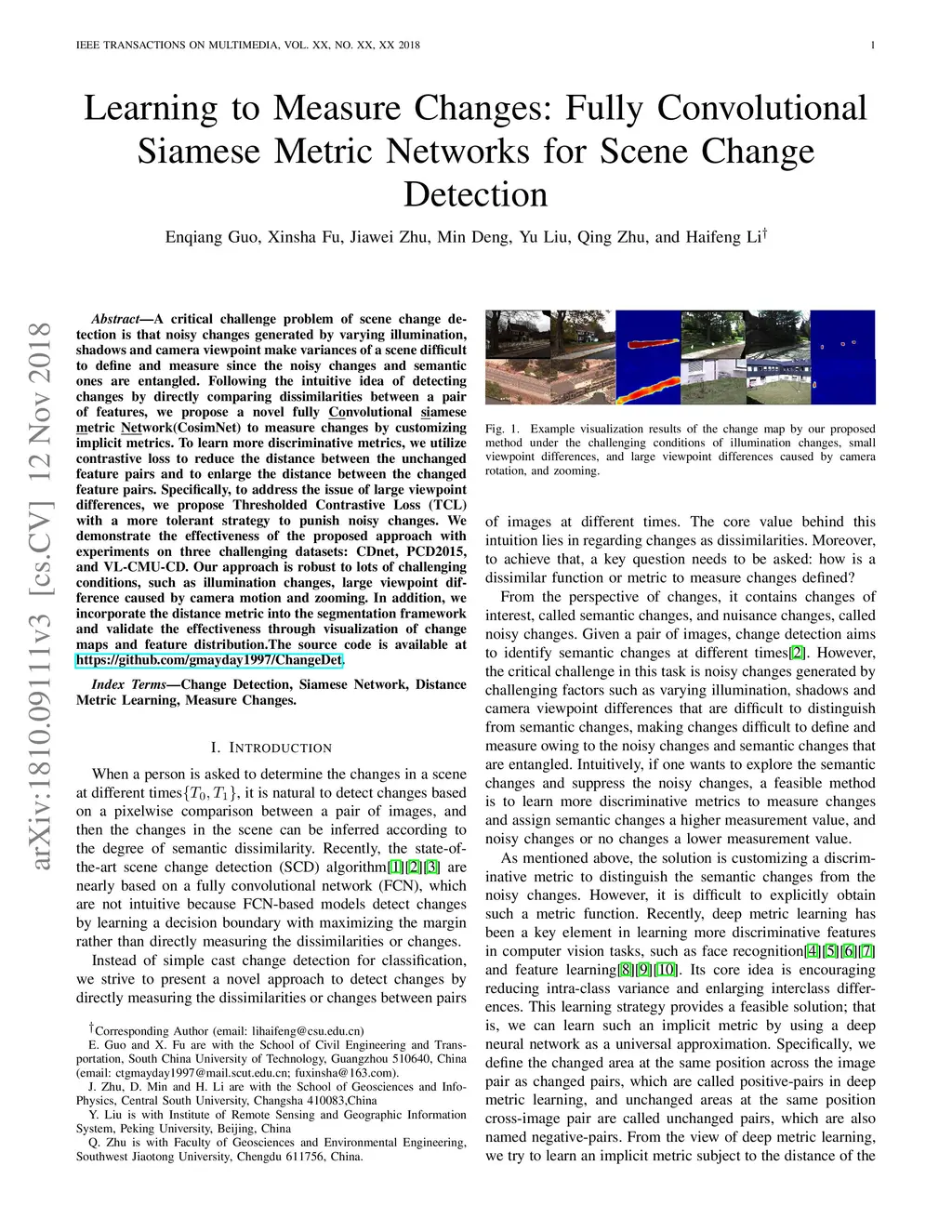 A critical challenge problem of scene change detection is that noisy changes generated by varying illumination, shadows and camera viewpoint make variances of a scene difficult to define and measure since the noisy changes and semantic ones are entangled. Following the intuitive idea of detecting changes by directly comparing dissimilarities between a pair of features, we propose a novel fully Convolutional siamese metric Network(CosimNet) to measure changes by customizing implicit metrics. To learn more discriminative metrics, we utilize contrastive loss to reduce the distance between the unchanged feature pairs and to enlarge the distance between the changed feature pairs. Specifically, to address the issue of large viewpoint differences, we propose Thresholded Contrastive Loss (TCL) with a more tolerant strategy to punish noisy changes. We demonstrate the effectiveness of the proposed approach with experiments on three challenging datasets: CDnet, PCD2015, and VL-CMU-CD. Our approach is robust to lots of challenging conditions, such as illumination changes, large viewpoint difference caused by camera motion and zooming. In addition, we incorporate the distance metric into the segmentation framework and validate the effectiveness through visualization of change maps and feature distribution. The source code is available at https://github.com/gmayday1997/ChangeDet.