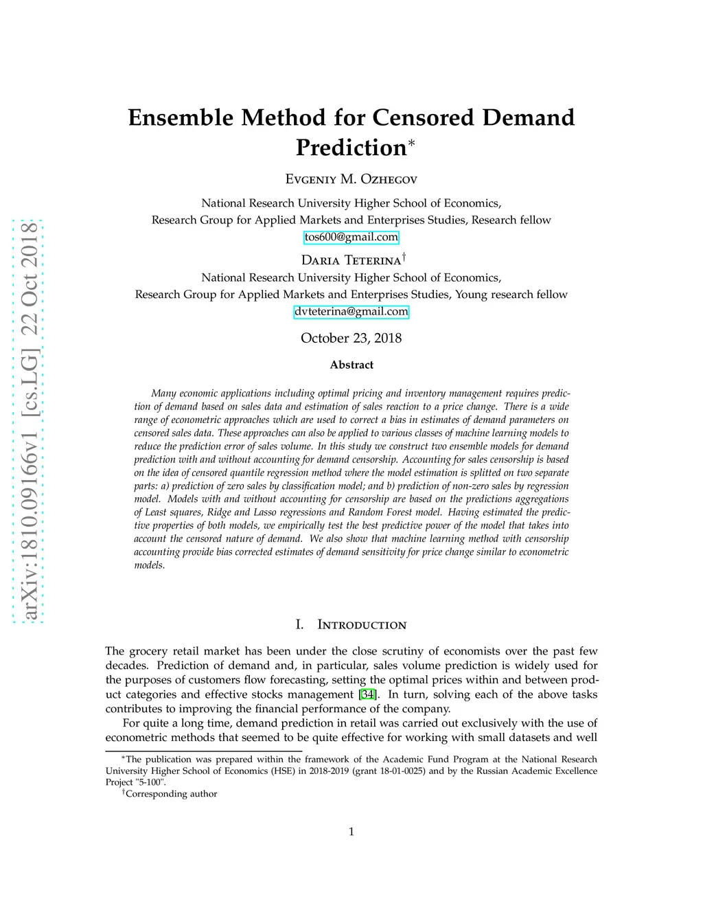 Many economic applications including optimal pricing and inventory management requires prediction of demand based on sales data and estimation of sales reaction to a price change. There is a wide range of econometric approaches which are used to correct a bias in estimates of demand parameters on censored sales data. These approaches can also be applied to various classes of machine learning models to reduce the prediction error of sales volume. In this study we construct two ensemble models for demand prediction with and without accounting for demand censorship. Accounting for sales censorship is based on the idea of censored quantile regression method where the model estimation is splitted on two separate parts: a) prediction of zero sales by classification model; and b) prediction of non-zero sales by regression model. Models with and without accounting for censorship are based on the predictions aggregations of Least squares, Ridge and Lasso regressions and Random Forest model. Having estimated the predictive properties of both models, we empirically test the best predictive power of the model that takes into account the censored nature of demand. We also show that machine learning method with censorship accounting provide bias corrected estimates of demand sensitivity for price change similar to econometric models.