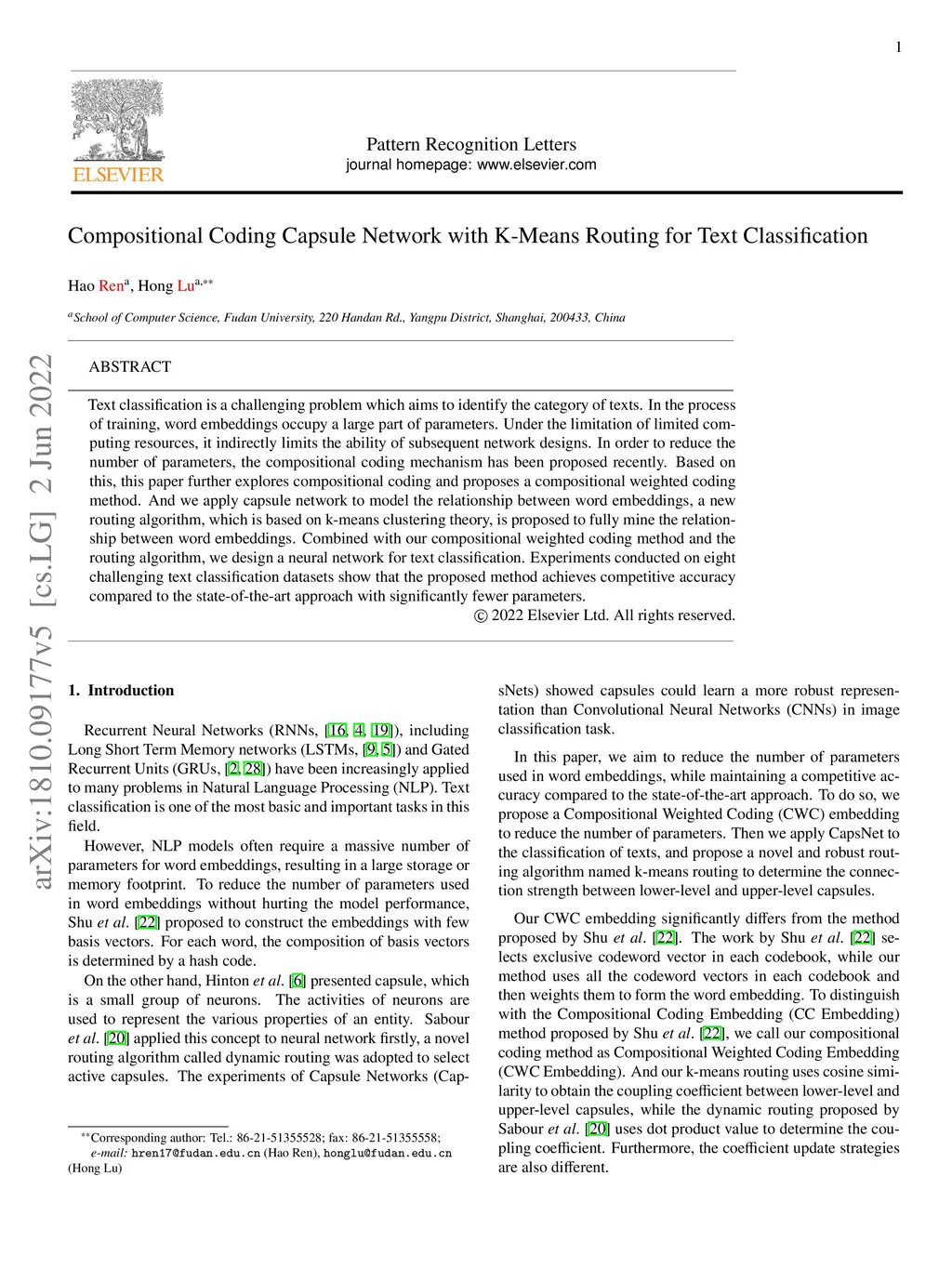 Compositional Coding Capsule Network with K-Means Routing for Text