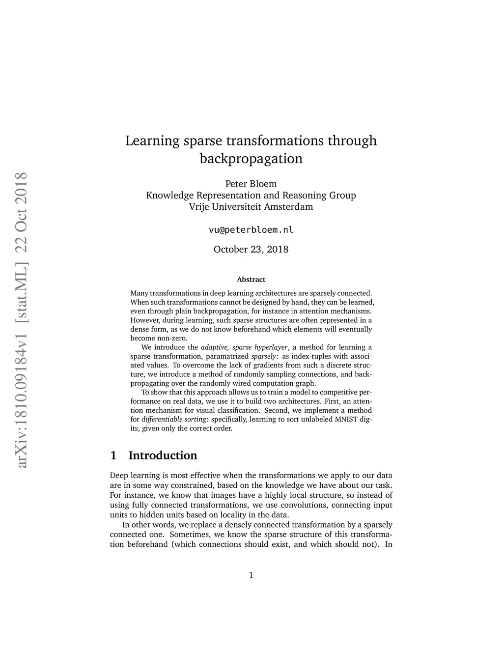 Many transformations in deep learning architectures are sparsely connected. When such transformations cannot be designed by hand, they can be learned, even through plain backpropagation, for instance in attention mechanisms. However, during learning, such sparse structures are often represented in a dense form, as we do not know beforehand which elements will eventually become non-zero. We introduce the adaptive, sparse hyperlayer, a method for learning a sparse transformation, paramatrized sparsely: as index-tuples with associated values. To overcome the lack of gradients from such a discrete structure, we introduce a method of randomly sampling connections, and backpropagating over the randomly wired computation graph. To show that this approach allows us to train a model to competitive performance on real data, we use it to build two architectures. First, an attention mechanism for visual classification. Second, we implement a method for differentiable sorting: specifically, learning to sort unlabeled MNIST digits, given only the correct order.
