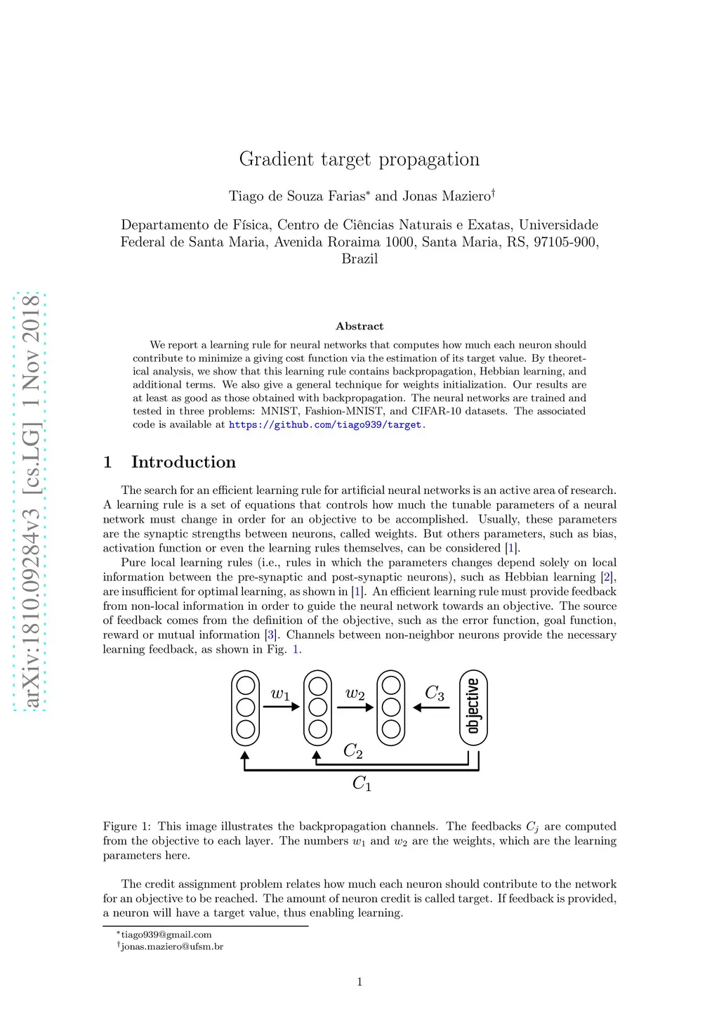 We report a learning rule for neural networks that computes how much each neuron should contribute to minimize a giving cost function via the estimation of its target value. By theoretical analysis, we show that this learning rule contains backpropagation, Hebian learning, and additional terms. We also give a general technique for weights initialization. Our results are at least as good as those obtained with backpropagation. The neural networks are trained and tested in three problems: MNIST, MNIST-Fashion, and CIFAR-10 datasets. The associated code is available at https://github.com/tiago939/target.