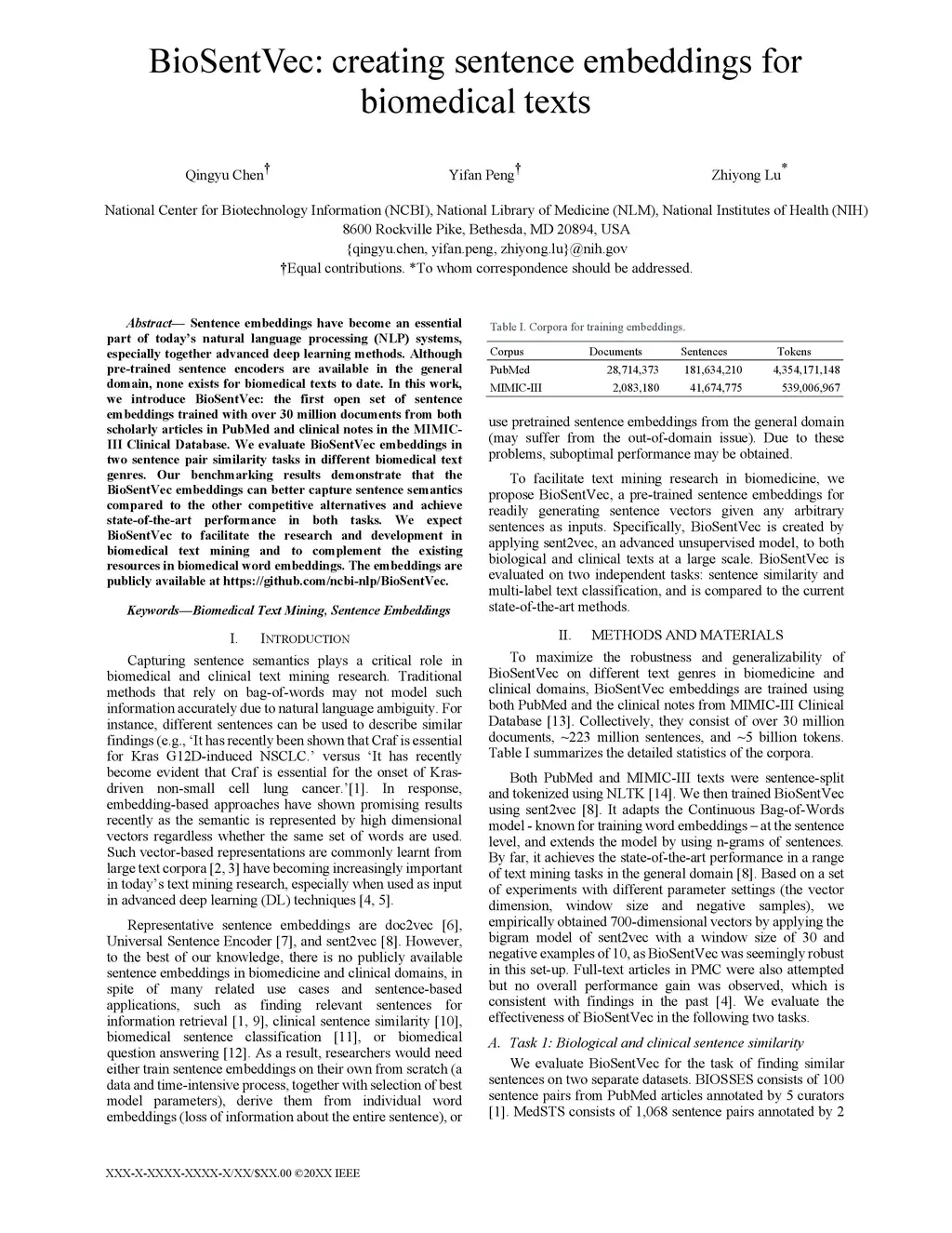 Sentence embeddings have become an essential part of today's natural language processing (NLP) systems, especially together advanced deep learning methods. Although pre-trained sentence encoders are available in the general domain, none exists for biomedical texts to date. In this work, we introduce BioSentVec: the first open set of sentence embeddings trained with over 30 million documents from both scholarly articles in PubMed and clinical notes in the MIMIC-III Clinical Database. We evaluate BioSentVec embeddings in two sentence pair similarity tasks in different text genres. Our benchmarking results demonstrate that the BioSentVec embeddings can better capture sentence semantics compared to the other competitive alternatives and achieve state-of-the-art performance in both tasks. We expect BioSentVec to facilitate the research and development in biomedical text mining and to complement the existing resources in biomedical word embeddings. BioSentVec is publicly available at https://github.com/ncbi-nlp/BioSentVec