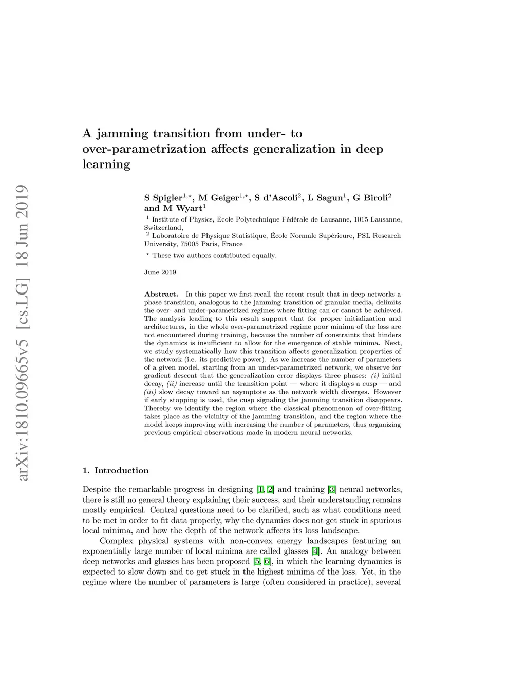 A jamming transition from under- to over-parametrization affects loss