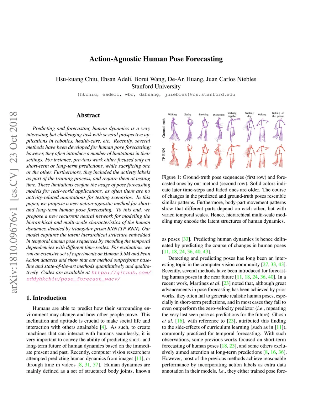 Predicting and forecasting human dynamics is a very interesting but challenging task with several prospective applications in robotics, health-care, etc. Recently, several methods have been developed for human pose forecasting; however, they often introduce a number of limitations in their settings. For instance, previous work either focused only on short-term or long-term predictions, while sacrificing one or the other. Furthermore, they included the activity labels as part of the training process, and require them at testing time. These limitations confine the usage of pose forecasting models for real-world applications, as often there are no activity-related annotations for testing scenarios. In this paper, we propose a new action-agnostic method for short- and long-term human pose forecasting. To this end, we propose a new recurrent neural network for modeling the hierarchical and multi-scale characteristics of the human dynamics, denoted by triangular-prism RNN (TP-RNN). Our model captures the latent hierarchical structure embedded in temporal human pose sequences by encoding the temporal dependencies with different time-scales. For evaluation, we run an extensive set of experiments on Human 3.6M and Penn Action datasets and show that our method outperforms baseline and state-of-the-art methods quantitatively and qualitatively. Codes are available at https://github.com/eddyhkchiu/pose_forecast_wacv/