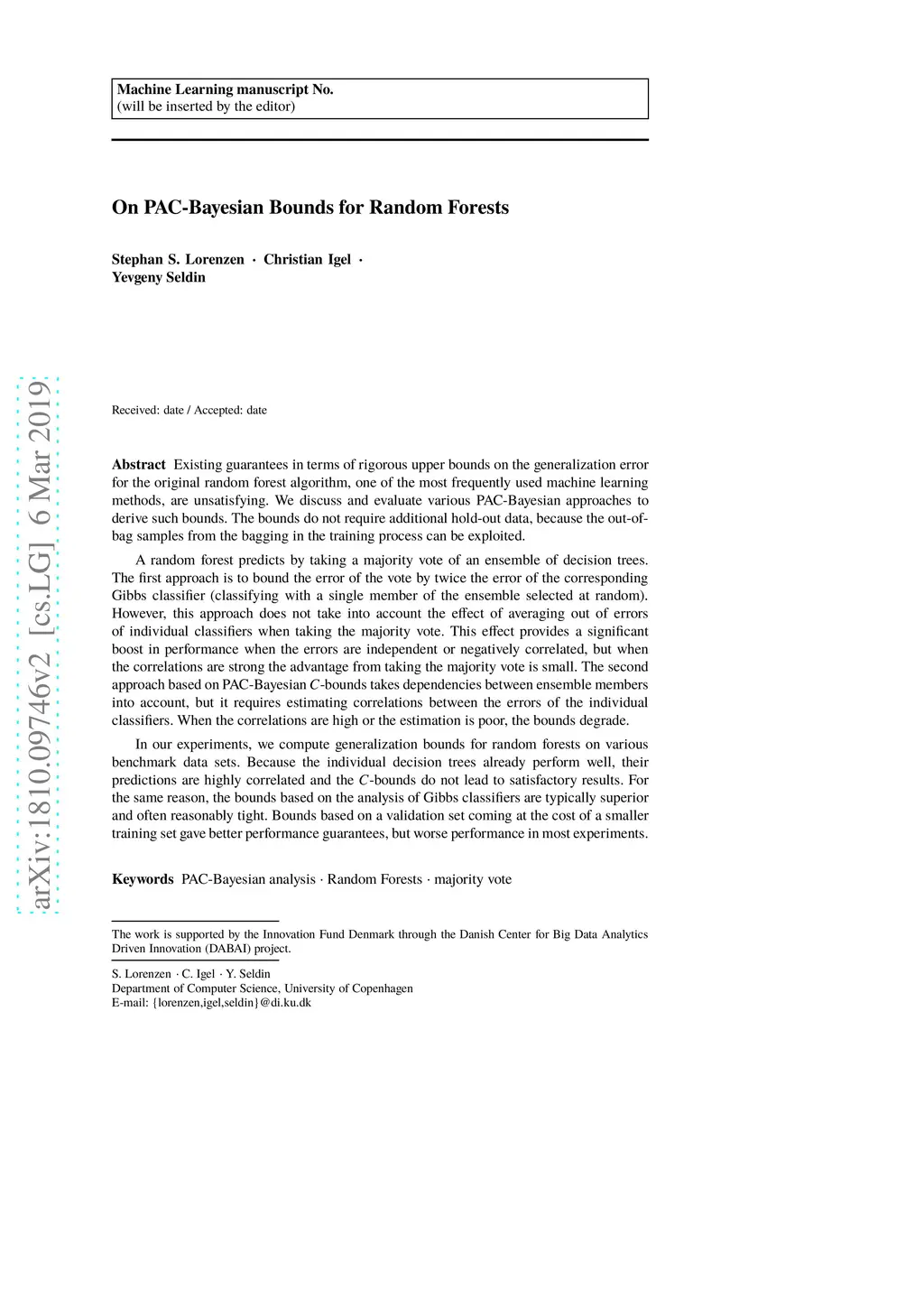 Existing guarantees in terms of rigorous upper bounds on the generalization error for the original random forest algorithm, one of the most frequently used machine learning methods, are unsatisfying. We discuss and evaluate various PAC-Bayesian approaches to derive such bounds. The bounds do not require additional hold-out data, because the out-of-bag samples from the bagging in the training process can be exploited. A random forest predicts by taking a majority vote of an ensemble of decision trees. The first approach is to bound the error of the vote by twice the error of the corresponding Gibbs classifier (classifying with a single member of the ensemble selected at random). However, this approach does not take into account the effect of averaging out of errors of individual classifiers when taking the majority vote. This effect provides a significant boost in performance when the errors are independent or negatively correlated, but when the correlations are strong the advantage from taking the majority vote is small. The second approach based on PAC-Bayesian C-bounds takes dependencies between ensemble members into account, but it requires estimating correlations between the errors of the individual classifiers. When the correlations are high or the estimation is poor, the bounds degrade. In our experiments, we compute generalization bounds for random forests on various benchmark data sets. Because the individual decision trees already perform well, their predictions are highly correlated and the C-bounds do not lead to satisfactory results. For the same reason, the bounds based on the analysis of Gibbs classifiers are typically superior and often reasonably tight. Bounds based on a validation set coming at the cost of a smaller training set gave better performance guarantees, but worse performance in most experiments.