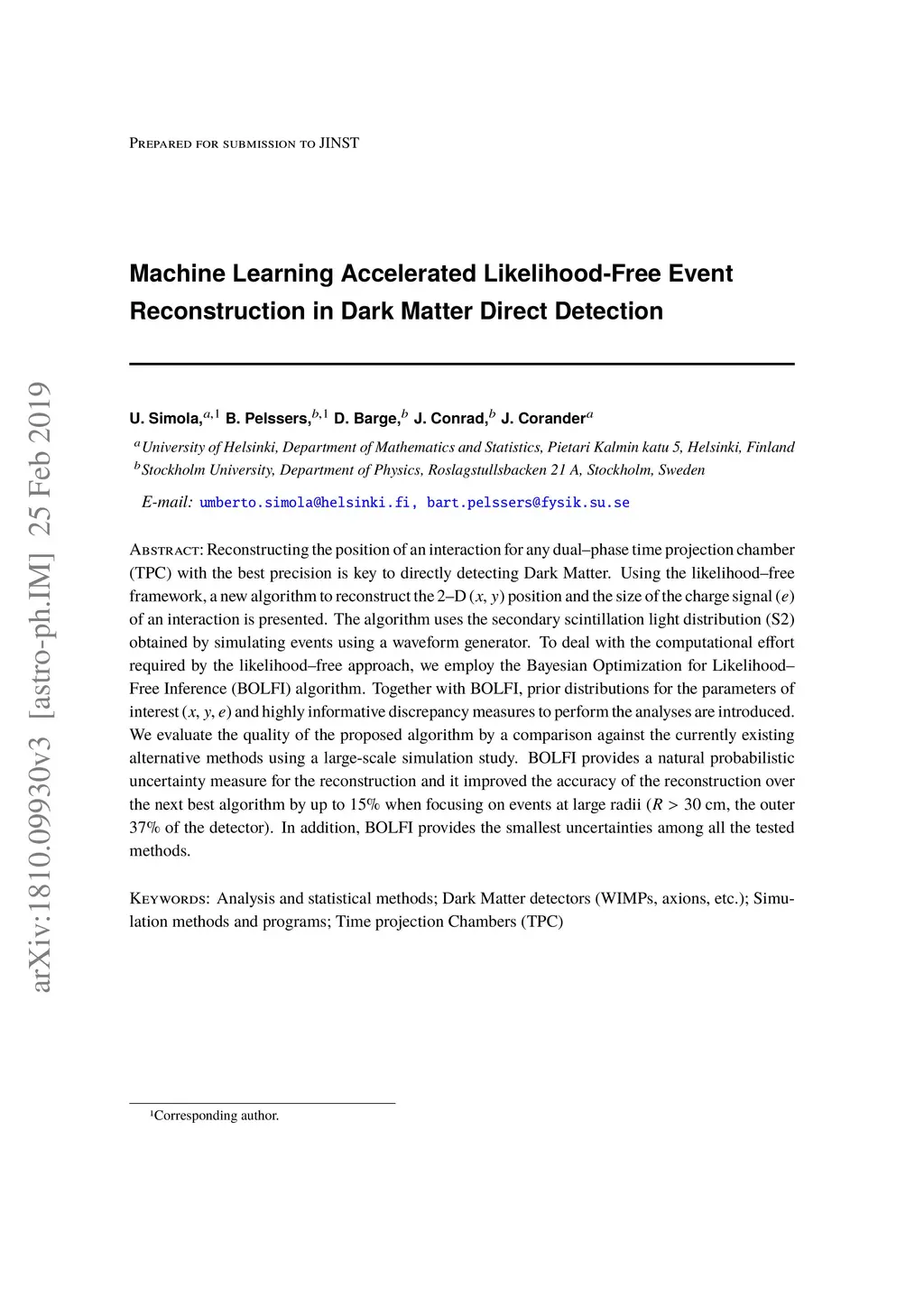 Reconstructing the position of an interaction for any dual-phase time projection chamber (TPC) with the best precision is key to directly detecting Dark Matter. Using the likelihood-free framework, a new algorithm to reconstruct the 2-D (x; y) position and the size of the charge signal (e) of an interaction is presented. The algorithm uses the charge signal (S2) light distribution obtained by simulating events using a waveform generator. To deal with the computational effort required by the likelihood-free approach, we employ the Bayesian Optimization for Likelihood-Free Inference (BOLFI) algorithm. Together with BOLFI, prior distributions for the parameters of interest (x; y; e) and highly informative discrepancy measures to perform the analyses are introduced. We evaluate the quality of the proposed algorithm by a comparison against the currently existing alternative methods using a large-scale simulation study. BOLFI provides a natural probabilistic uncertainty measure for the reconstruction and it improved the accuracy of the reconstruction over the next best algorithm by up to 15% when focusing on events over a large radii (R > 30 cm, the outer 37% of the detector). In addition, BOLFI provides the smallest uncertainties among all the tested methods.