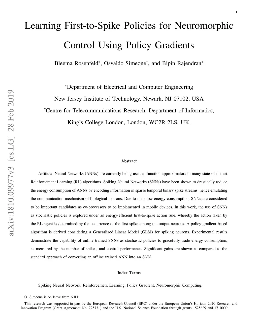 Learning First-to-Spike Policies for Neuromorphic Control Using Policy