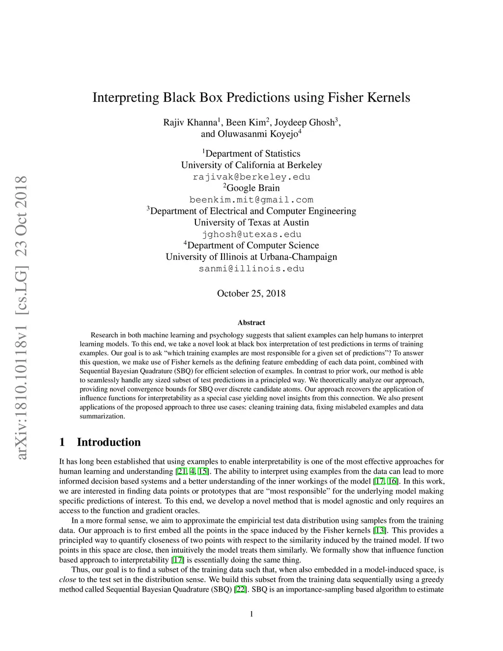 Research in both machine learning and psychology suggests that salient examples can help humans to interpret learning models. To this end, we take a novel look at black box interpretation of test predictions in terms of training examples. Our goal is to ask `which training examples are most responsible for a given set of predictions'? To answer this question, we make use of Fisher kernels as the defining feature embedding of each data point, combined with Sequential Bayesian Quadrature (SBQ) for efficient selection of examples. In contrast to prior work, our method is able to seamlessly handle any sized subset of test predictions in a principled way. We theoretically analyze our approach, providing novel convergence bounds for SBQ over discrete candidate atoms. Our approach recovers the application of influence functions for interpretability as a special case yielding novel insights from this connection. We also present applications of the proposed approach to three use cases: cleaning training data, fixing mislabeled examples and data summarization.