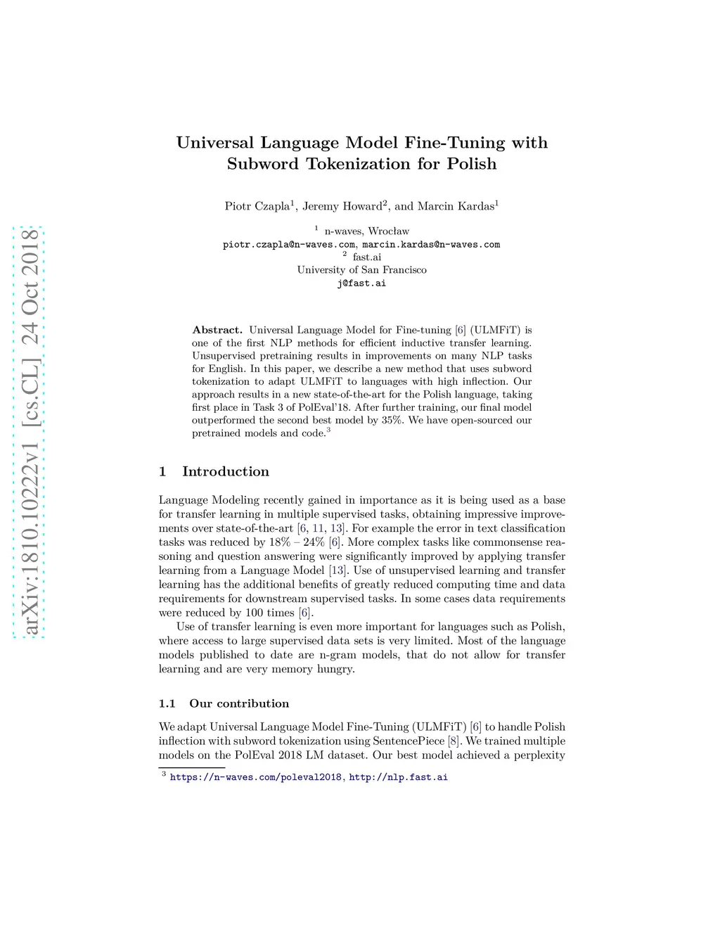 Universal Language Model for Fine-tuning [arXiv:1801.06146] (ULMFiT) is one of the first NLP methods for efficient inductive transfer learning. Unsupervised pretraining results in improvements on many NLP tasks for English. In this paper, we describe a new method that uses subword tokenization to adapt ULMFiT to languages with high inflection. Our approach results in a new state-of-the-art for the Polish language, taking first place in Task 3 of PolEval'18. After further training, our final model outperformed the second best model by 35%. We have open-sourced our pretrained models and code.