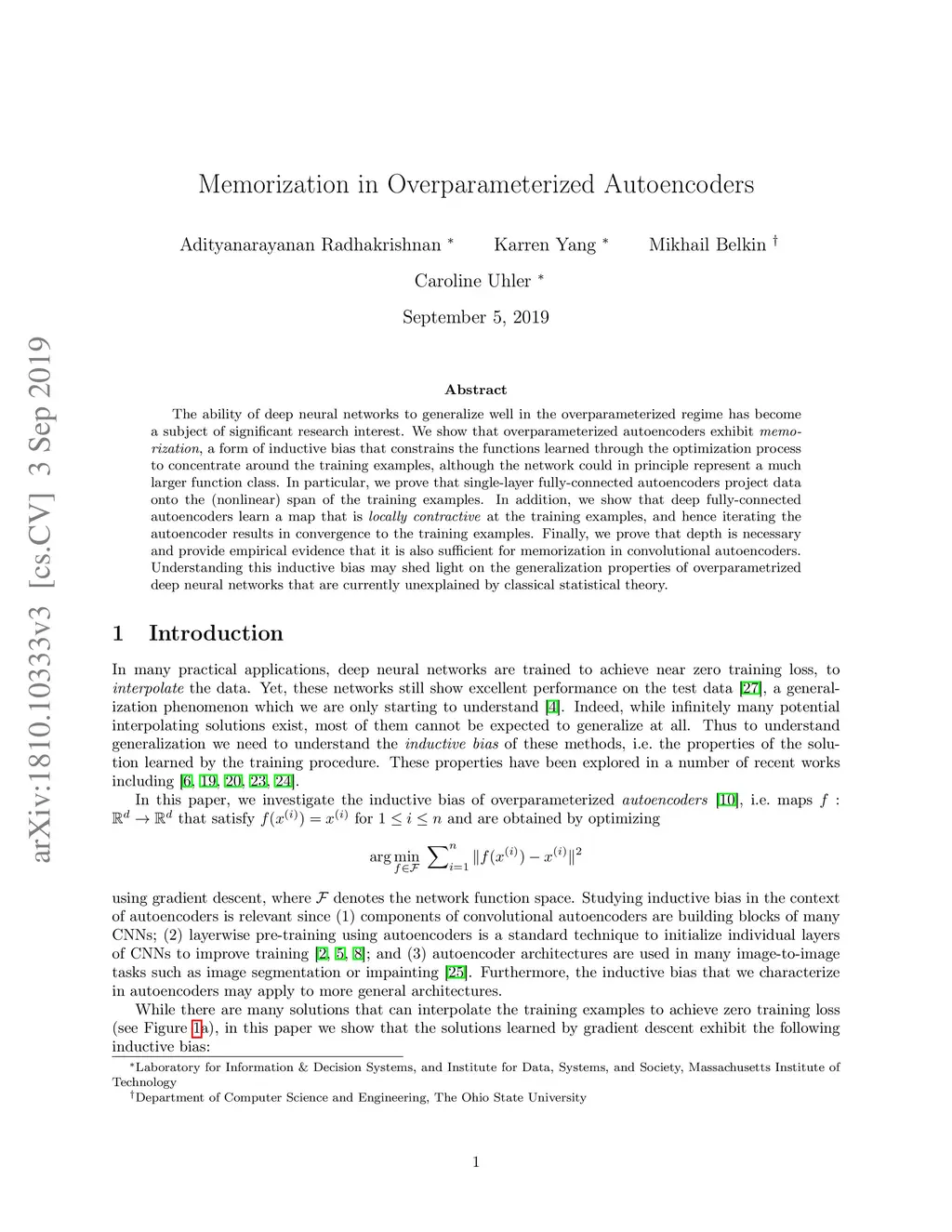 The ability of deep neural networks to generalize well in the overparameterized regime has become a subject of significant research interest. We show that overparameterized autoencoders exhibit memorization, a form of inductive bias that constrains the functions learned through the optimization process to concentrate around the training examples, although the network could in principle represent a much larger function class. In particular, we prove that single-layer fully-connected autoencoders project data onto the (nonlinear) span of the training examples. In addition, we show that deep fully-connected autoencoders learn a map that is locally contractive at the training examples, and hence iterating the autoencoder results in convergence to the training examples. Finally, we prove that depth is necessary and provide empirical evidence that it is also sufficient for memorization in convolutional autoencoders. Understanding this inductive bias may shed light on the generalization properties of overparametrized deep neural networks that are currently unexplained by classical statistical theory.