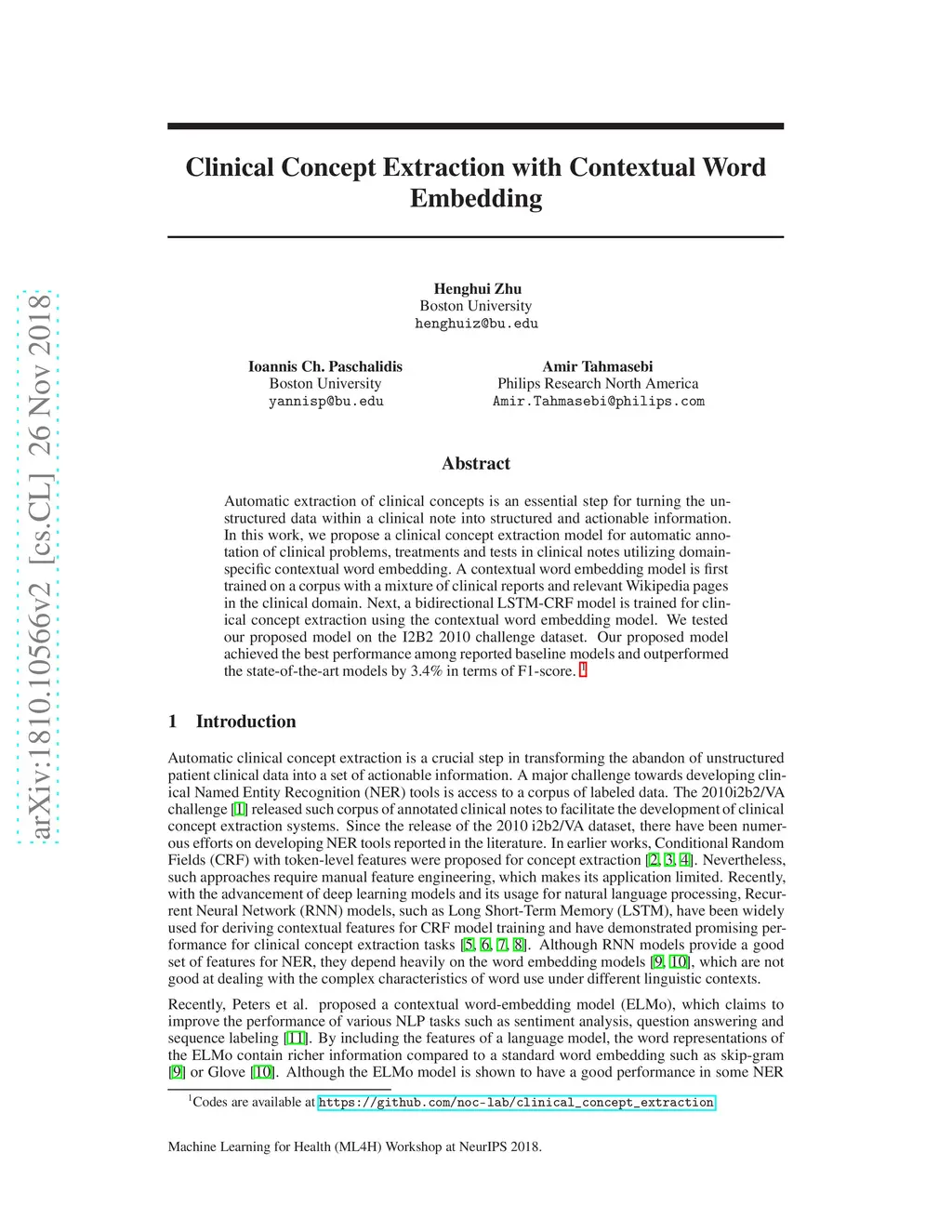 Clinical Concept Extraction with Contextual Word Embedding