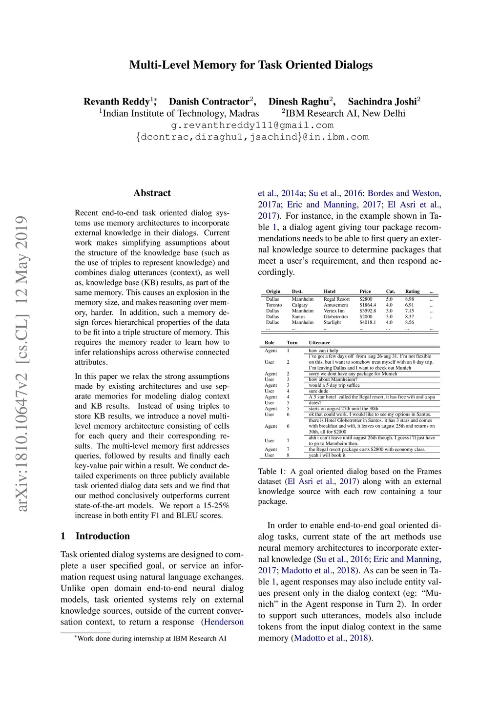Recent end-to-end task oriented dialog systems use memory architectures to incorporate external knowledge in their dialogs. Current work makes simplifying assumptions about the structure of the knowledge base, such as the use of triples to represent knowledge, and combines dialog utterances (context) as well as knowledge base (KB) results as part of the same memory. This causes an explosion in the memory size, and makes the reasoning over memory harder. In addition, such a memory design forces hierarchical properties of the data to be fit into a triple structure of memory. This requires the memory reader to infer relationships across otherwise connected attributes. In this paper we relax the strong assumptions made by existing architectures and separate memories used for modeling dialog context and KB results. Instead of using triples to store KB results, we introduce a novel multi-level memory architecture consisting of cells for each query and their corresponding results. The multi-level memory first addresses queries, followed by results and finally each key-value pair within a result. We conduct detailed experiments on three publicly available task oriented dialog data sets and we find that our method conclusively outperforms current state-of-the-art models. We report a 15-25% increase in both entity F1 and BLEU scores.
