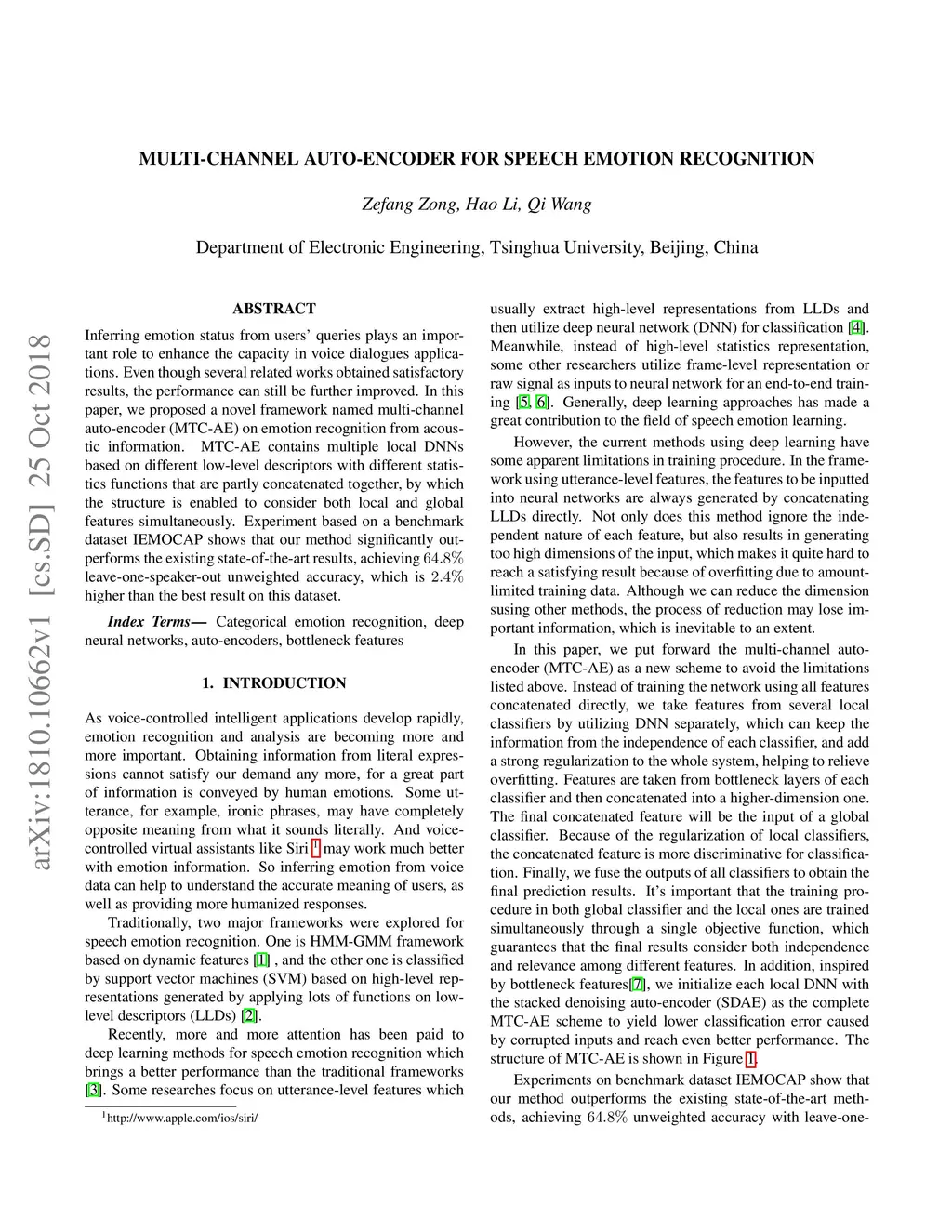 Inferring emotion status from users' queries plays an important role to enhance the capacity in voice dialogues applications. Even though several related works obtained satisfactory results, the performance can still be further improved. In this paper, we proposed a novel framework named multi-channel auto-encoder (MTC-AE) on emotion recognition from acoustic information. MTC-AE contains multiple local DNNs based on different low-level descriptors with different statistics functions that are partly concatenated together, by which the structure is enabled to consider both local and global features simultaneously. Experiment based on a benchmark dataset IEMOCAP shows that our method significantly outperforms the existing state-of-the-art results, achieving leave-one-speaker-out unweighted accuracy, which is higher than the best result on this dataset.