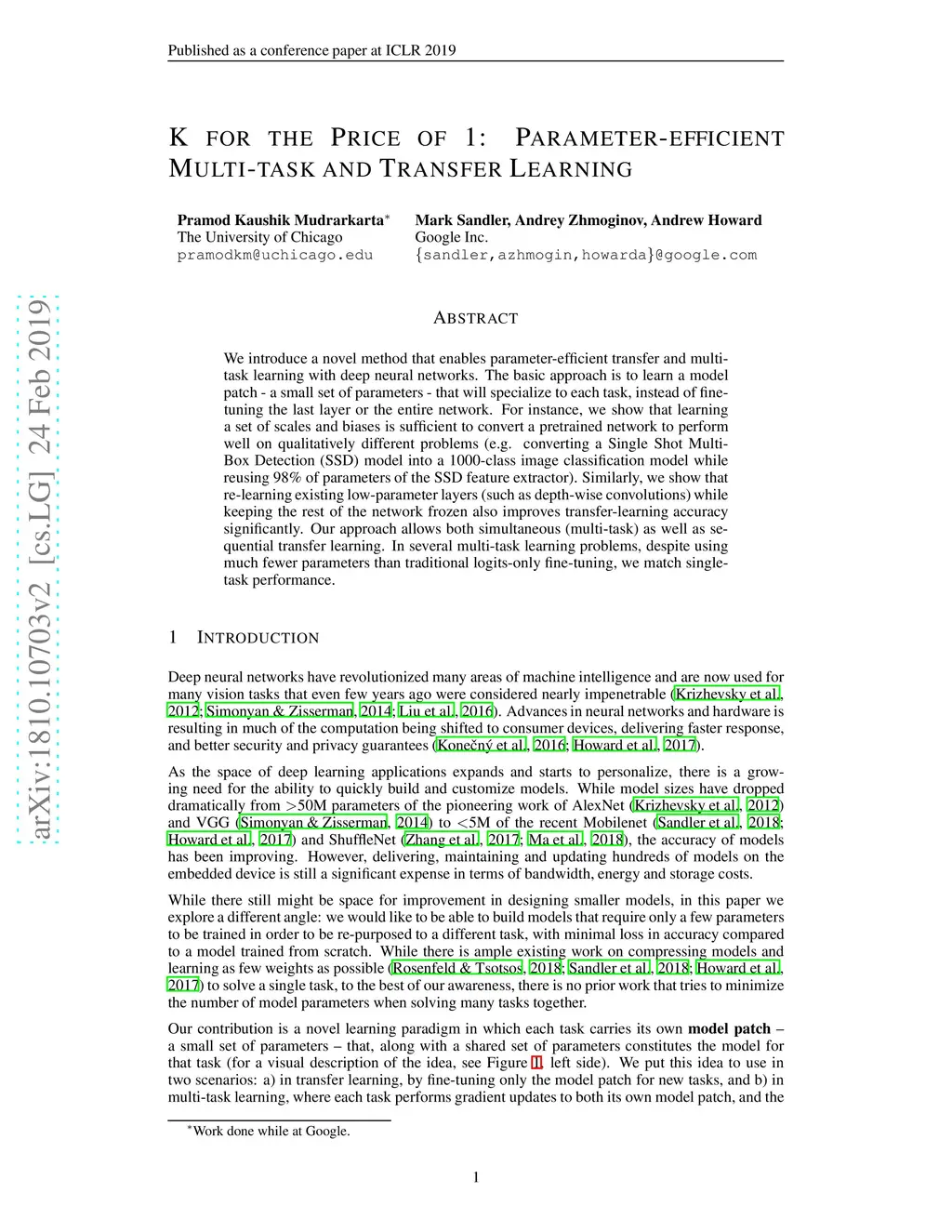 We introduce a novel method that enables parameter-efficient transfer and multi-task learning with deep neural networks. The basic approach is to learn a model patch - a small set of parameters - that will specialize to each task, instead of fine-tuning the last layer or the entire network. For instance, we show that learning a set of scales and biases is sufficient to convert a pretrained network to perform well on qualitatively different problems (e.g. converting a Single Shot MultiBox Detection (SSD) model into a 1000-class image classification model while reusing 98% of parameters of the SSD feature extractor). Similarly, we show that re-learning existing low-parameter layers (such as depth-wise convolutions) while keeping the rest of the network frozen also improves transfer-learning accuracy significantly. Our approach allows both simultaneous (multi-task) as well as sequential transfer learning. In several multi-task learning problems, despite using much fewer parameters than traditional logits-only fine-tuning, we match single-task performance.
