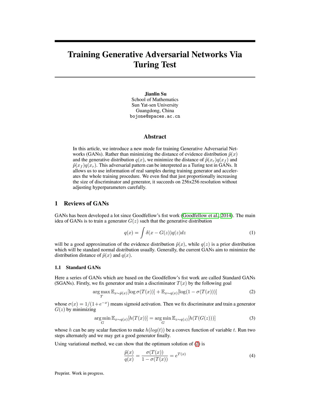 In this article, we introduce a new mode for training Generative Adversarial Networks (GANs). Rather than minimizing the distance of evidence distribution and the generative distribution , we minimize the distance of and . This adversarial pattern can be interpreted as a Turing test in GANs. It allows us to use information of real samples during training generator and accelerates the whole training procedure. We even find that just proportionally increasing the size of discriminator and generator, it succeeds on 256x256 resolution without adjusting hyperparameters carefully.