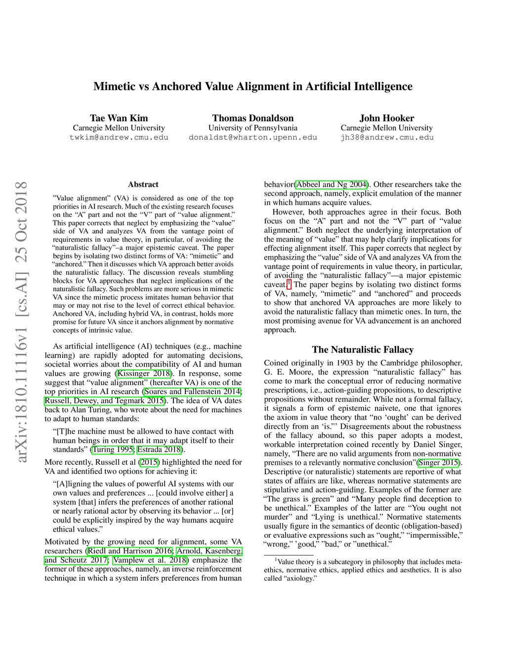 "Value alignment" (VA) is considered as one of the top priorities in AI research. Much of the existing research focuses on the "A" part and not the "V" part of "value alignment." This paper corrects that neglect by emphasizing the "value" side of VA and analyzes VA from the vantage point of requirements in value theory, in particular, of avoiding the "naturalistic fallacy"--a major epistemic caveat. The paper begins by isolating two distinct forms of VA: "mimetic" and "anchored." Then it discusses which VA approach better avoids the naturalistic fallacy. The discussion reveals stumbling blocks for VA approaches that neglect implications of the naturalistic fallacy. Such problems are more serious in mimetic VA since the mimetic process imitates human behavior that may or may not rise to the level of correct ethical behavior. Anchored VA, including hybrid VA, in contrast, holds more promise for future VA since it anchors alignment by normative concepts of intrinsic value.