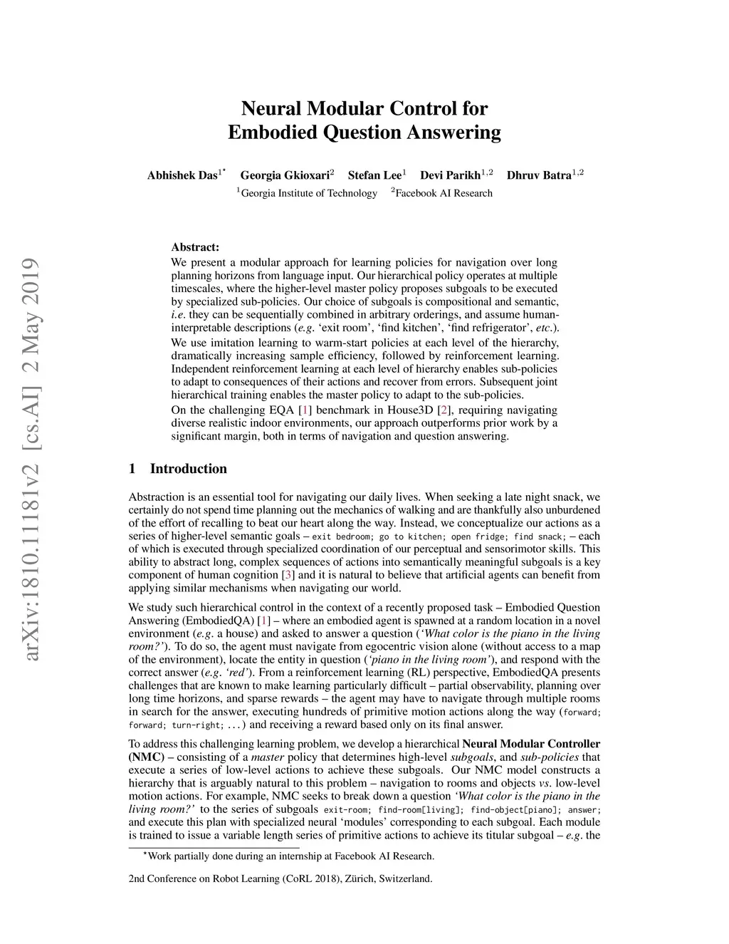 Neural Modular Control for Embodied Question Answering