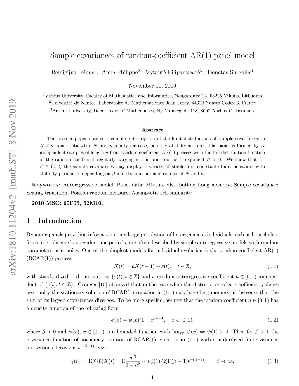 The present paper obtains a complete description of the limit distributions of sample covariances in N x n panel data when N and n jointly increase, possibly at different rate. The panel is formed by N independent samples of length n from random-coefficient AR(1) process with the tail distribution function of the random coefficient regularly varying at the unit root with exponent > 0. We show that for (0, 2) the sample covariances may display a variety of stable and non-stable limit behaviors with stability parameter depending on and the mutual increase rate of N and n.