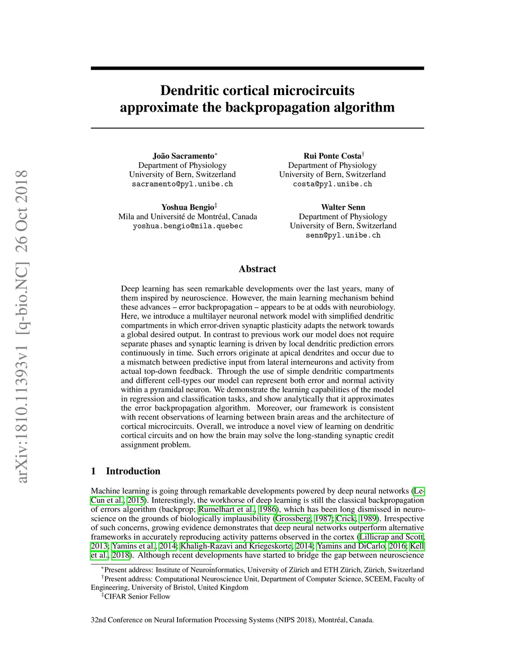 Deep learning has seen remarkable developments over the last years, many of them inspired by neuroscience. However, the main learning mechanism behind these advances - error backpropagation - appears to be at odds with neurobiology. Here, we introduce a multilayer neuronal network model with simplified dendritic compartments in which error-driven synaptic plasticity adapts the network towards a global desired output. In contrast to previous work our model does not require separate phases and synaptic learning is driven by local dendritic prediction errors continuously in time. Such errors originate at apical dendrites and occur due to a mismatch between predictive input from lateral interneurons and activity from actual top-down feedback. Through the use of simple dendritic compartments and different cell-types our model can represent both error and normal activity within a pyramidal neuron. We demonstrate the learning capabilities of the model in regression and classification tasks, and show analytically that it approximates the error backpropagation algorithm. Moreover, our framework is consistent with recent observations of learning between brain areas and the architecture of cortical microcircuits. Overall, we introduce a novel view of learning on dendritic cortical circuits and on how the brain may solve the long-standing synaptic credit assignment problem.