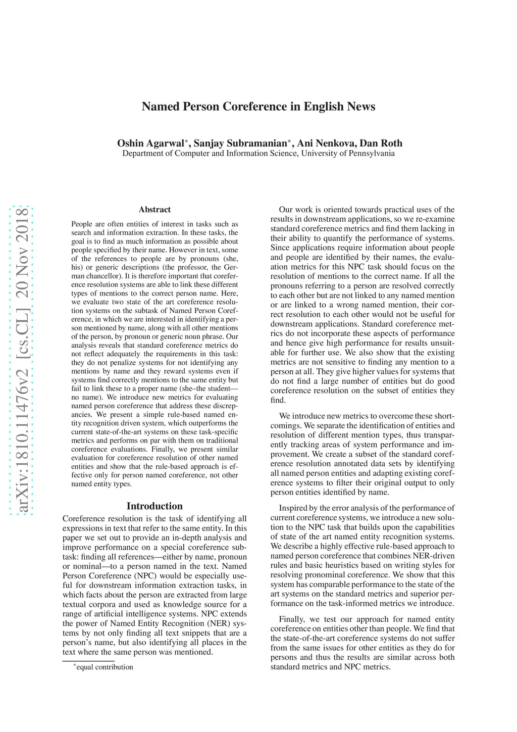 People are often entities of interest in tasks such as search and information extraction. In these tasks, the goal is to find as much information as possible about people specified by their name. However in text, some of the references to people are by pronouns (she, his) or generic descriptions (the professor, the German chancellor). It is therefore important that coreference resolution systems are able to link these different types of mentions to the correct person name. Here, we evaluate two state of the art coreference resolution systems on the subtask of Named Person Coreference, in which we are interested in identifying a person mentioned by name, along with all other mentions of the person, by pronoun or generic noun phrase. Our analysis reveals that standard coreference metrics do not reflect adequately the requirements in this task: they do not penalize systems for not identifying any mentions by name and they reward systems even if systems find correctly mentions to the same entity but fail to link these to a proper name (she--the student---no name). We introduce new metrics for evaluating named person coreference that address these discrepancies. We present a simple rule-based named entity recognition driven system, which outperforms the current state-of-the-art systems on these task-specific metrics and performs on par with them on traditional coreference evaluations. Finally, we present similar evaluation for coreference resolution of other named entities and show that the rule-based approach is effective only for person named coreference, not other named entity types.