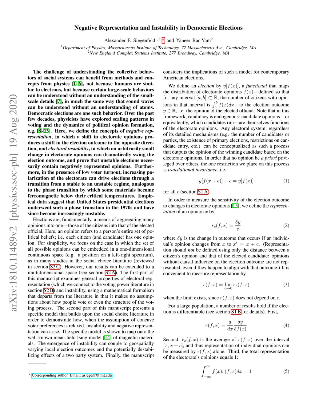 The challenge of understanding the collective behaviors of social systems can benefit from methods and concepts from physics [1-6], not because humans are similar to electrons, but because certain large-scale behaviors can be understood without an understanding of the small-scale details [7], in much the same way that sound waves can be understood without an understanding of atoms. Democratic elections are one such behavior. Over the past few decades, physicists have explored scaling patterns in voting and the dynamics of political opinion formation, e.g. [8-13]. Here, we define the concepts of negative representation, in which a shift in electorate opinions produces a shift in the election outcome in the opposite direction, and electoral instability, in which an arbitrarily small change in electorate opinions can dramatically swing the election outcome, and prove that unstable elections necessarily contain negatively represented opinions. Furthermore, in the presence of low voter turnout, increasing polarization of the electorate can drive elections through a transition from a stable to an unstable regime, analogous to the phase transition by which some materials become ferromagnetic below their critical temperatures. Empirical data suggest that United States presidential elections underwent such a phase transition in the 1970s and have since become increasingly unstable.