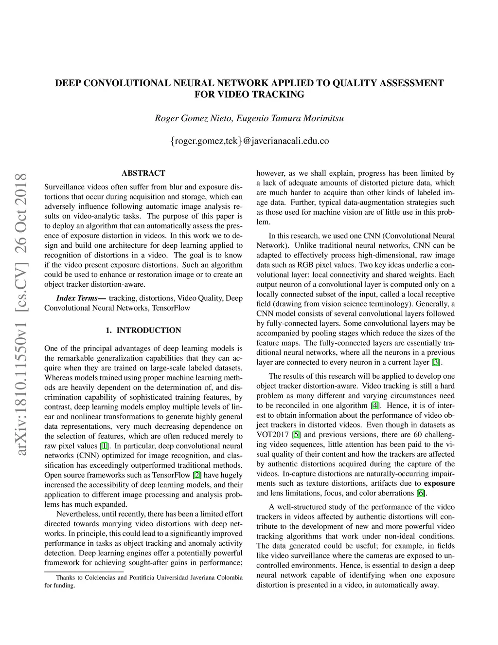 Surveillance videos often suffer from blur and exposure distortions that occur during acquisition and storage, which can adversely influence following automatic image analysis results on video-analytic tasks. The purpose of this paper is to deploy an algorithm that can automatically assess the presence of exposure distortion in videos. In this work we to design and build one architecture for deep learning applied to recognition of distortions in a video. The goal is to know if the video present exposure distortions. Such an algorithm could be used to enhance or restoration image or to create an object tracker distortion-aware.