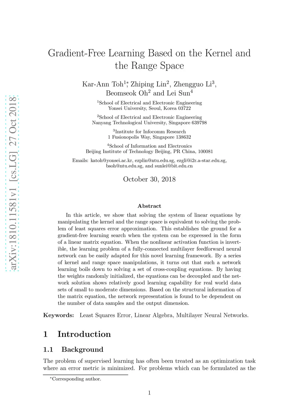 In this article, we show that solving the system of linear equations by manipulating the kernel and the range space is equivalent to solving the problem of least squares error approximation. This establishes the ground for a gradient-free learning search when the system can be expressed in the form of a linear matrix equation. When the nonlinear activation function is invertible, the learning problem of a fully-connected multilayer feedforward neural network can be easily adapted for this novel learning framework. By a series of kernel and range space manipulations, it turns out that such a network learning boils down to solving a set of cross-coupling equations. By having the weights randomly initialized, the equations can be decoupled and the network solution shows relatively good learning capability for real world data sets of small to moderate dimensions. Based on the structural information of the matrix equation, the network representation is found to be dependent on the number of data samples and the output dimension.