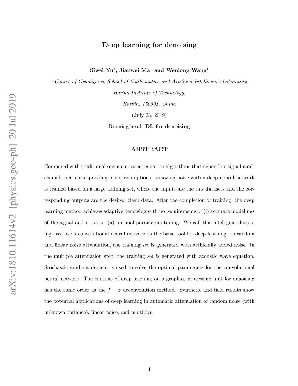 Compared with traditional seismic noise attenuation algorithms that depend on signal models and their corresponding prior assumptions, removing noise with a deep neural network is trained based on a large training set, where the inputs are the raw datasets and the corresponding outputs are the desired clean data. After the completion of training, the deep learning method achieves adaptive denoising with no requirements of (i) accurate modelings of the signal and noise, or (ii) optimal parameters tuning. We call this intelligent denoising. We use a convolutional neural network as the basic tool for deep learning. In random and linear noise attenuation, the training set is generated with artificially added noise. In the multiple attenuation step, the training set is generated with acoustic wave equation. Stochastic gradient descent is used to solve the optimal parameters for the convolutional neural network. The runtime of deep learning on a graphics processing unit for denoising has the same order as the deconvolution method. Synthetic and field results show the potential applications of deep learning in automatic attenuation of random noise (with unknown variance), linear noise, and multiples.