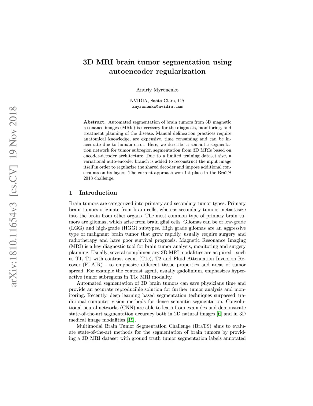 Automated segmentation of brain tumors from 3D magnetic resonance images (MRIs) is necessary for the diagnosis, monitoring, and treatment planning of the disease. Manual delineation practices require anatomical knowledge, are expensive, time consuming and can be inaccurate due to human error. Here, we describe a semantic segmentation network for tumor subregion segmentation from 3D MRIs based on encoder-decoder architecture. Due to a limited training dataset size, a variational auto-encoder branch is added to reconstruct the input image itself in order to regularize the shared decoder and impose additional constraints on its layers. The current approach won 1st place in the BraTS 2018 challenge.