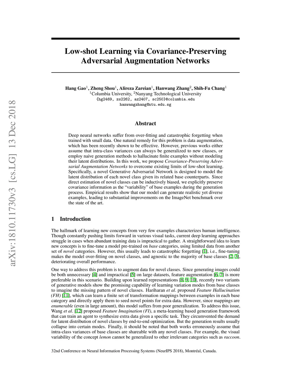 Low-shot Learning via Covariance-Preserving Adversarial Augmentation