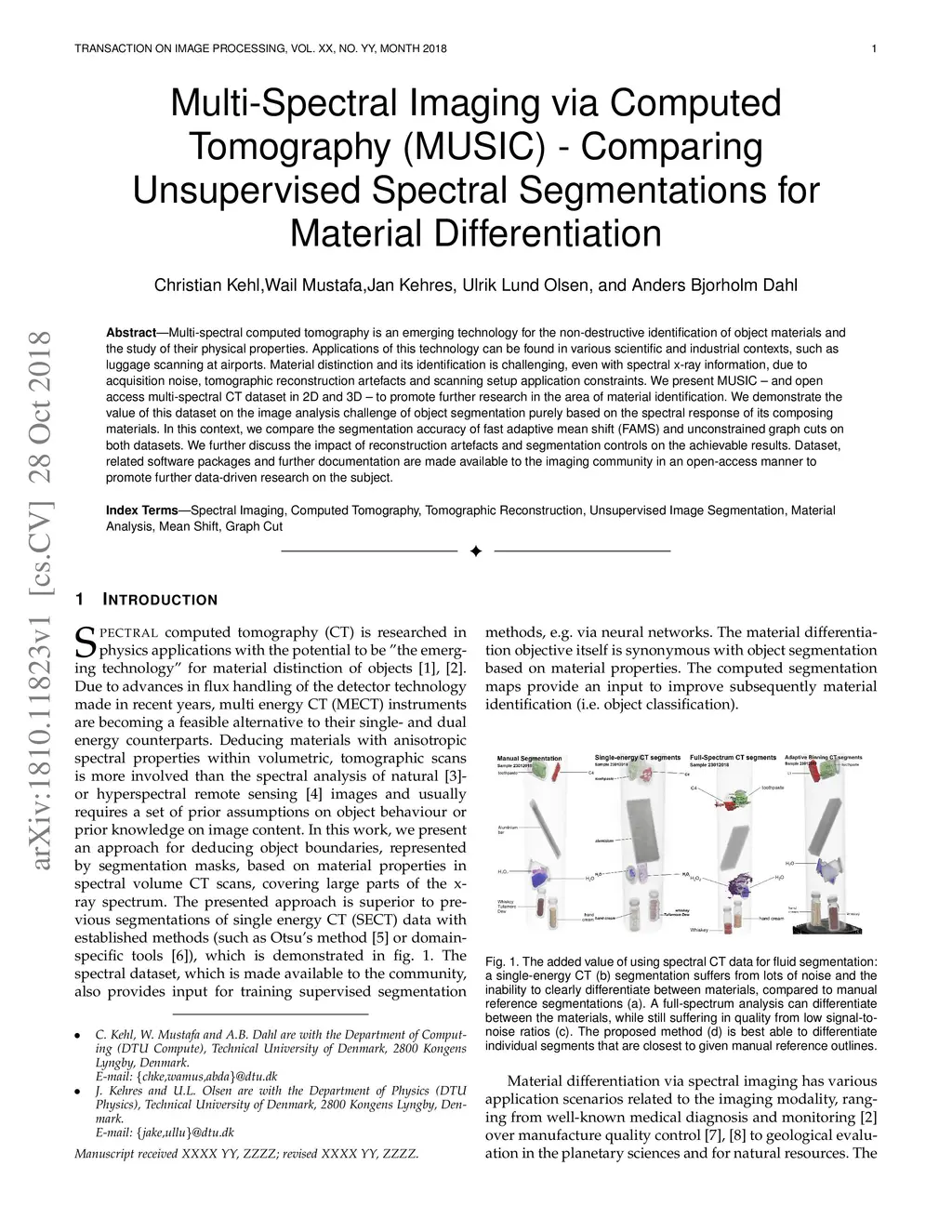 Multi-spectral computed tomography is an emerging technology for the non-destructive identification of object materials and the study of their physical properties. Applications of this technology can be found in various scientific and industrial contexts, such as luggage scanning at airports. Material distinction and its identification is challenging, even with spectral x-ray information, due to acquisition noise, tomographic reconstruction artefacts and scanning setup application constraints. We present MUSIC - and open access multi-spectral CT dataset in 2D and 3D - to promote further research in the area of material identification. We demonstrate the value of this dataset on the image analysis challenge of object segmentation purely based on the spectral response of its composing materials. In this context, we compare the segmentation accuracy of fast adaptive mean shift (FAMS) and unconstrained graph cuts on both datasets. We further discuss the impact of reconstruction artefacts and segmentation controls on the achievable results. Dataset, related software packages and further documentation are made available to the imaging community in an open-access manner to promote further data-driven research on the subject