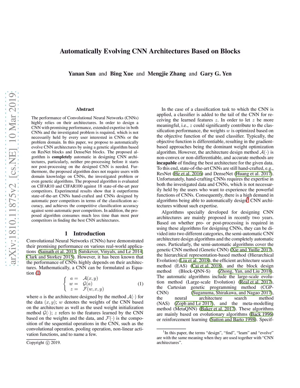 The performance of Convolutional Neural Networks (CNNs) highly relies on their architectures. In order to design a CNN with promising performance, extended expertise in both CNNs and the investigated problem is required, which is not necessarily held by every user interested in CNNs or the problem domain. In this paper, we propose to automatically evolve CNN architectures by using a genetic algorithm based on ResNet blocks and DenseNet blocks. The proposed algorithm is \textbf{completely} automatic in designing CNN architectures, particularly, neither pre-processing before it starts nor post-processing on the designed CNN is needed. Furthermore, the proposed algorithm does not require users with domain knowledge on CNNs, the investigated problem or even genetic algorithms. The proposed algorithm is evaluated on CIFAR10 and CIFAR100 against 18 state-of-the-art peer competitors. Experimental results show that it outperforms state-of-the-art CNNs hand-crafted and CNNs designed by automatic peer competitors in terms of the classification accuracy, and achieves the competitive classification accuracy against semi-automatic peer competitors. In addition, the proposed algorithm consumes much less time than most peer competitors in finding the best CNN architectures.