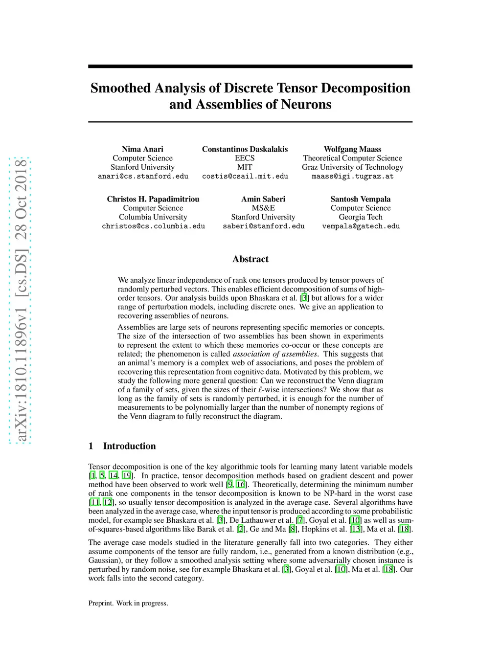 We analyze linear independence of rank one tensors produced by tensor powers of randomly perturbed vectors. This enables efficient decomposition of sums of high-order tensors. Our analysis builds upon [BCMV14] but allows for a wider range of perturbation models, including discrete ones. We give an application to recovering assemblies of neurons. Assemblies are large sets of neurons representing specific memories or concepts. The size of the intersection of two assemblies has been shown in experiments to represent the extent to which these memories co-occur or these concepts are related; the phenomenon is called association of assemblies. This suggests that an animal's memory is a complex web of associations, and poses the problem of recovering this representation from cognitive data. Motivated by this problem, we study the following more general question: Can we reconstruct the Venn diagram of a family of sets, given the sizes of their -wise intersections? We show that as long as the family of sets is randomly perturbed, it is enough for the number of measurements to be polynomially larger than the number of nonempty regions of the Venn diagram to fully reconstruct the diagram.
