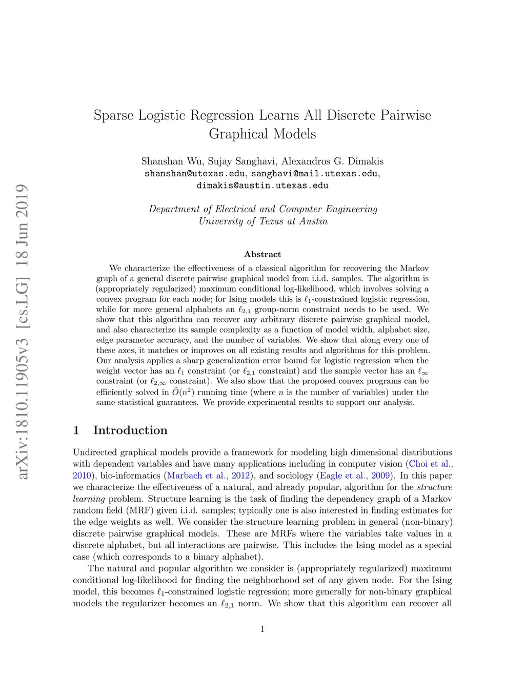 We characterize the effectiveness of a classical algorithm for recovering the Markov graph of a general discrete pairwise graphical model from i.i.d. samples. The algorithm is (appropriately regularized) maximum conditional log-likelihood, which involves solving a convex program for each node; for Ising models this is -constrained logistic regression, while for more general alphabets an group-norm constraint needs to be used. We show that this algorithm can recover any arbitrary discrete pairwise graphical model, and also characterize its sample complexity as a function of model width, alphabet size, edge parameter accuracy, and the number of variables. We show that along every one of these axes, it matches or improves on all existing results and algorithms for this problem. Our analysis applies a sharp generalization error bound for logistic regression when the weight vector has an constraint (or constraint) and the sample vector has an constraint (or constraint). We also show that the proposed convex programs can be efficiently solved in running time (where is the number of variables) under the same statistical guarantees. We provide experimental results to support our analysis.
