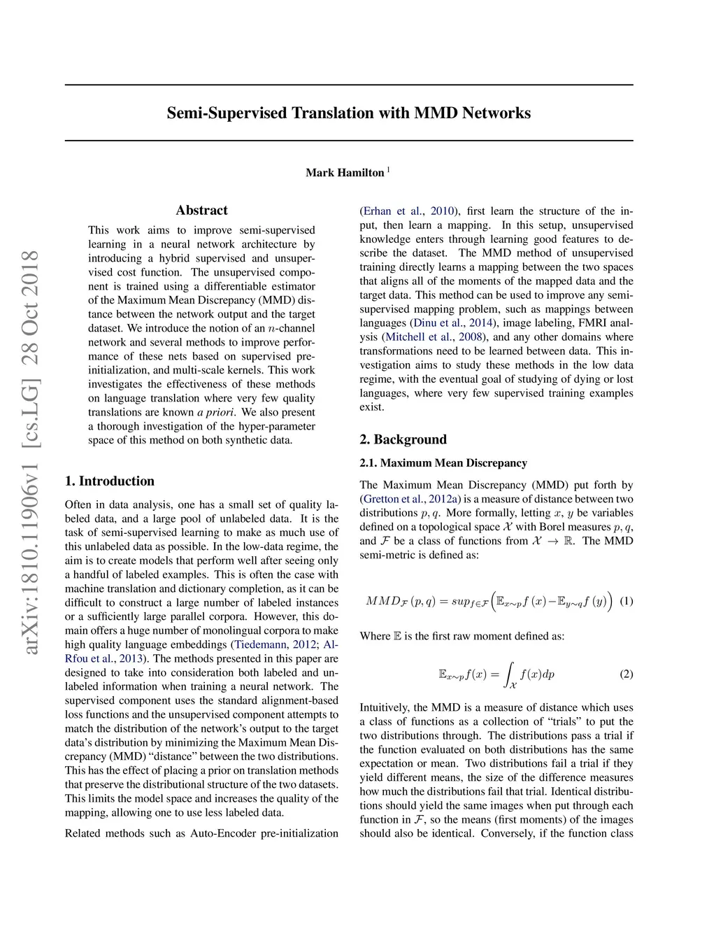 This work aims to improve semi-supervised learning in a neural network architecture by introducing a hybrid supervised and unsupervised cost function. The unsupervised component is trained using a differentiable estimator of the Maximum Mean Discrepancy (MMD) distance between the network output and the target dataset. We introduce the notion of an -channel network and several methods to improve performance of these nets based on supervised pre-initialization, and multi-scale kernels. This work investigates the effectiveness of these methods on language translation where very few quality translations are known \textit{a priori}. We also present a thorough investigation of the hyper-parameter space of this method on both synthetic data.