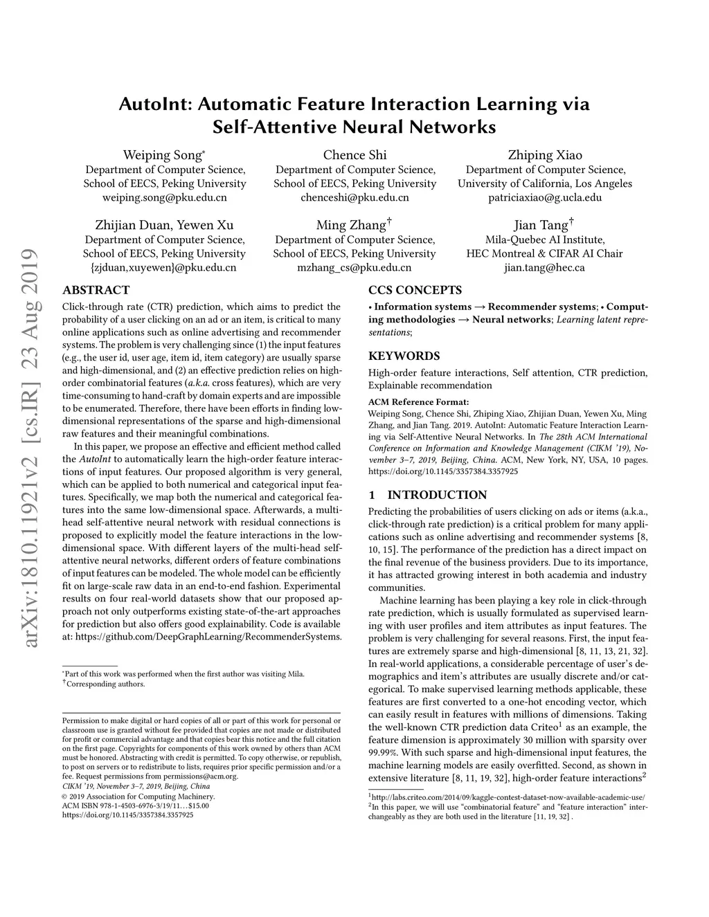 AutoInt: Automatic Feature Interaction Learning via Self-Attentive