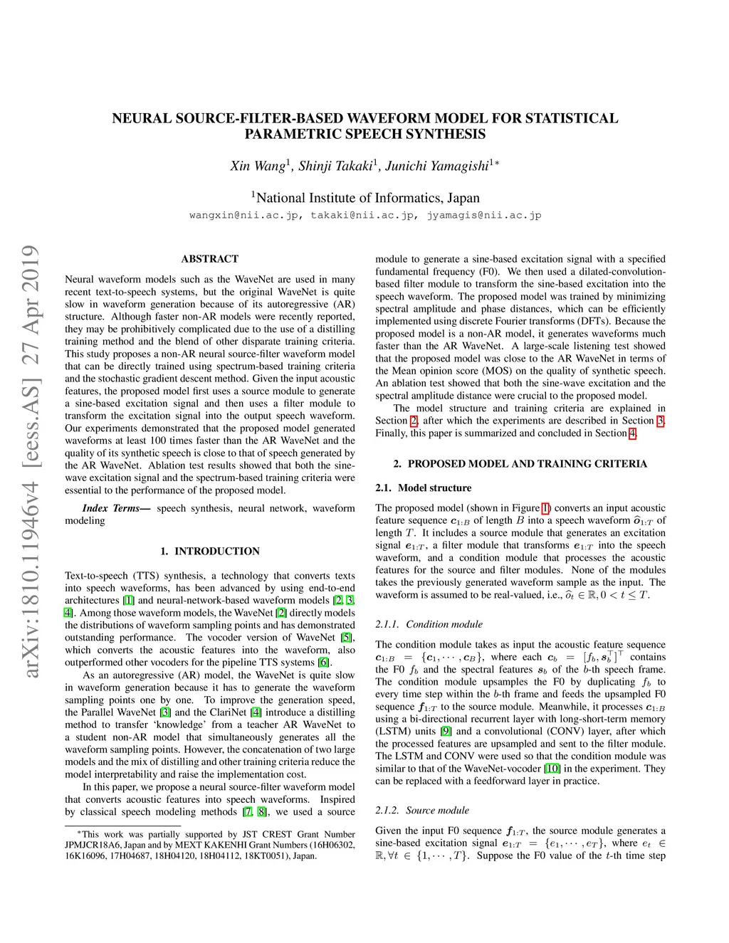 Neural source-filter-based waveform model for statistical parametric