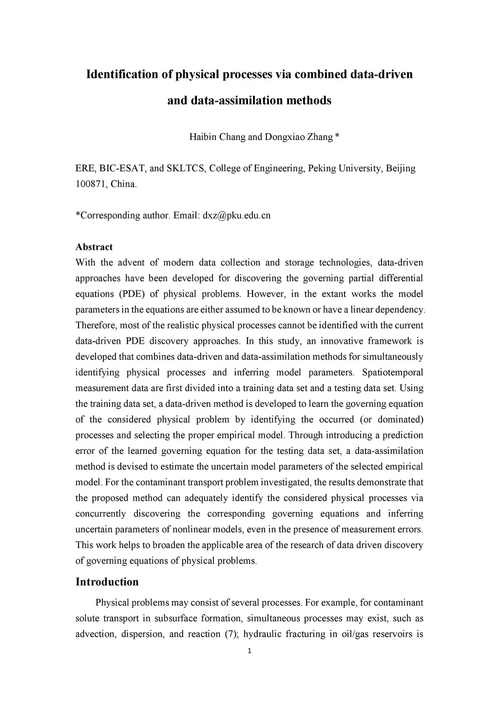 With the advent of modern data collection and storage technologies, data-driven approaches have been developed for discovering the governing partial differential equations (PDE) of physical problems. However, in the extant works the model parameters in the equations are either assumed to be known or have a linear dependency. Therefore, most of the realistic physical processes cannot be identified with the current data-driven PDE discovery approaches. In this study, an innovative framework is developed that combines data-driven and data-assimilation methods for simultaneously identifying physical processes and inferring model parameters. Spatiotemporal measurement data are first divided into a training data set and a testing data set. Using the training data set, a data-driven method is developed to learn the governing equation of the considered physical problem by identifying the occurred (or dominated) processes and selecting the proper empirical model. Through introducing a prediction error of the learned governing equation for the testing data set, a data-assimilation method is devised to estimate the uncertain model parameters of the selected empirical model. For the contaminant transport problem investigated, the results demonstrate that the proposed method can adequately identify the considered physical processes via concurrently discovering the corresponding governing equations and inferring uncertain parameters of nonlinear models, even in the presence of measurement errors. This work helps to broaden the applicable area of the research of data driven discovery of governing equations of physical problems.