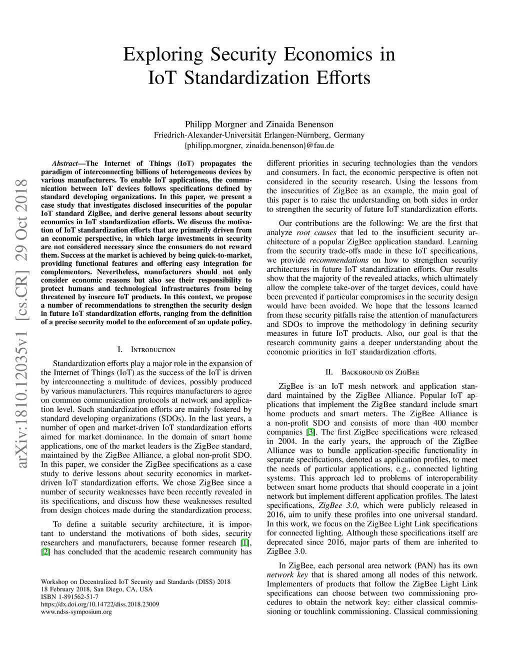 The Internet of Things (IoT) propagates the paradigm of interconnecting billions of heterogeneous devices by various manufacturers. To enable IoT applications, the communication between IoT devices follows specifications defined by standard developing organizations. In this paper, we present a case study that investigates disclosed insecurities of the popular IoT standard ZigBee, and derive general lessons about security economics in IoT standardization efforts. We discuss the motivation of IoT standardization efforts that are primarily driven from an economic perspective, in which large investments in security are not considered necessary since the consumers do not reward them. Success at the market is achieved by being quick-to-market, providing functional features and offering easy integration for complementors. Nevertheless, manufacturers should not only consider economic reasons but also see their responsibility to protect humans and technological infrastructures from being threatened by insecure IoT products. In this context, we propose a number of recommendations to strengthen the security design in future IoT standardization efforts, ranging from the definition of a precise security model to the enforcement of an update policy.