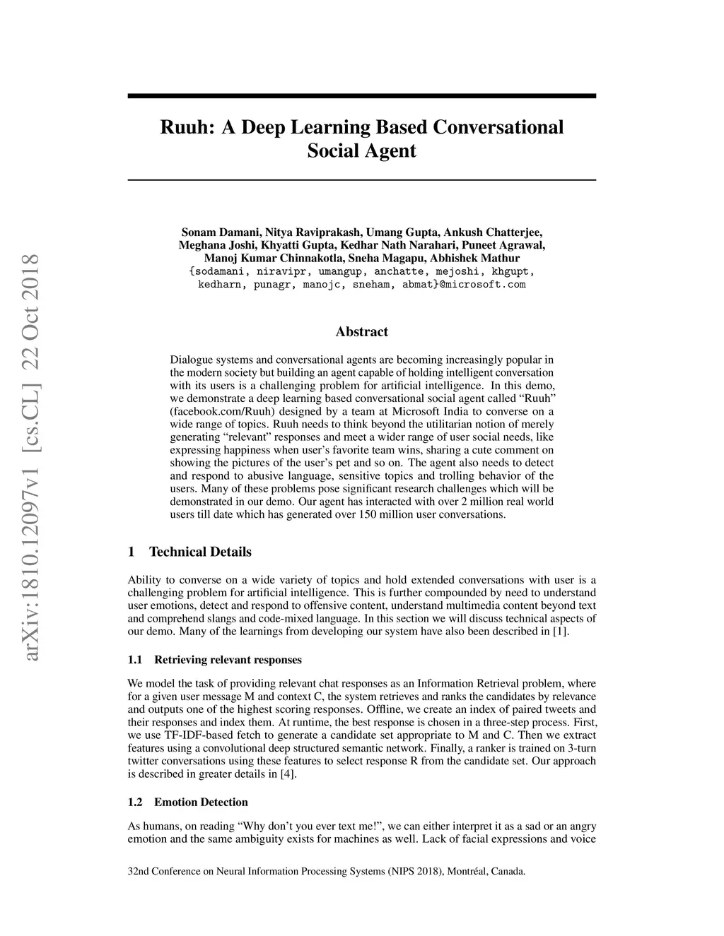 Dialogue systems and conversational agents are becoming increasingly popular in the modern society but building an agent capable of holding intelligent conversation with its users is a challenging problem for artificial intelligence. In this demo, we demonstrate a deep learning based conversational social agent called "Ruuh" (facebook.com/Ruuh) designed by a team at Microsoft India to converse on a wide range of topics. Ruuh needs to think beyond the utilitarian notion of merely generating "relevant" responses and meet a wider range of user social needs, like expressing happiness when user's favorite team wins, sharing a cute comment on showing the pictures of the user's pet and so on. The agent also needs to detect and respond to abusive language, sensitive topics and trolling behavior of the users. Many of these problems pose significant research challenges which will be demonstrated in our demo. Our agent has interacted with over 2 million real world users till date which has generated over 150 million user conversations.