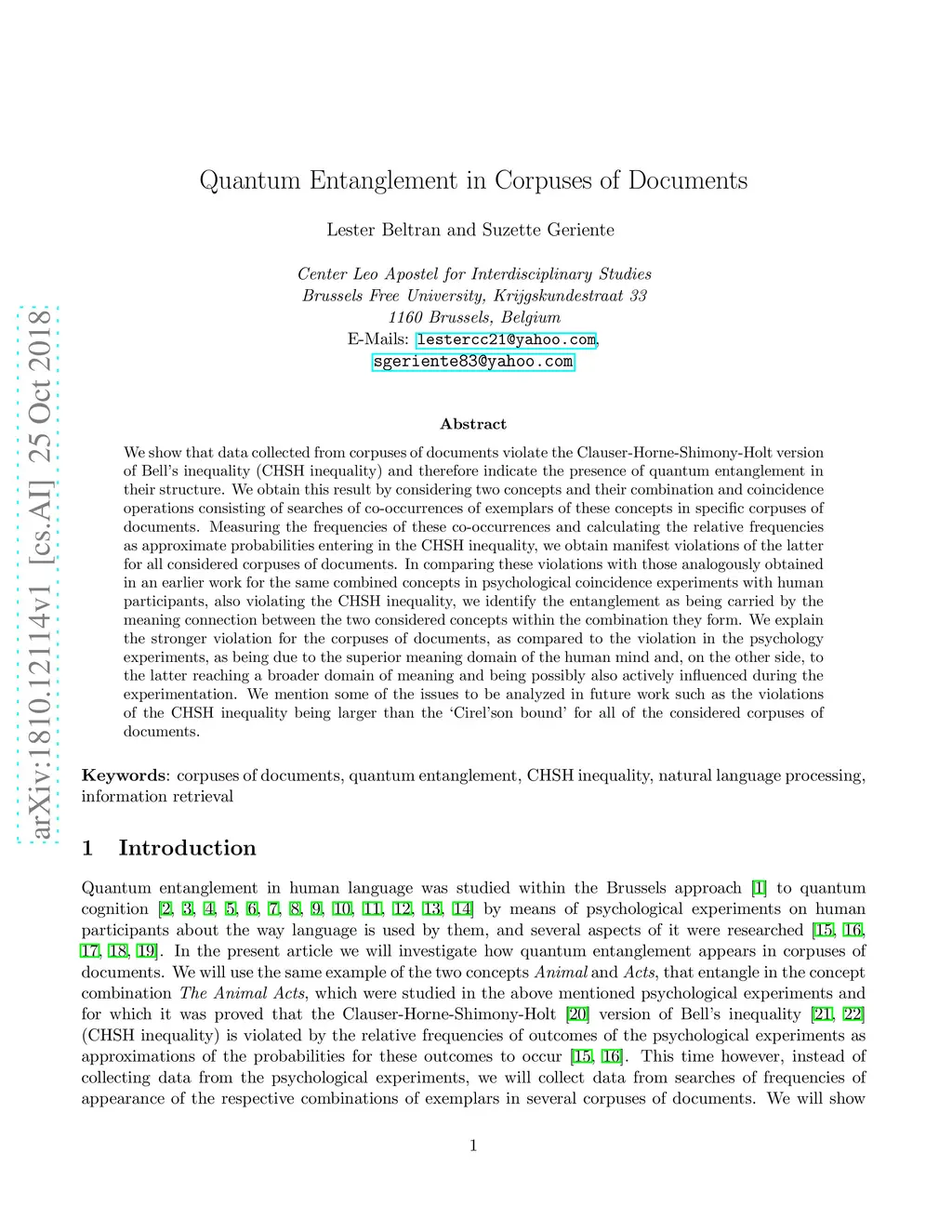 Quantum Entanglement in Corpuses of Documents