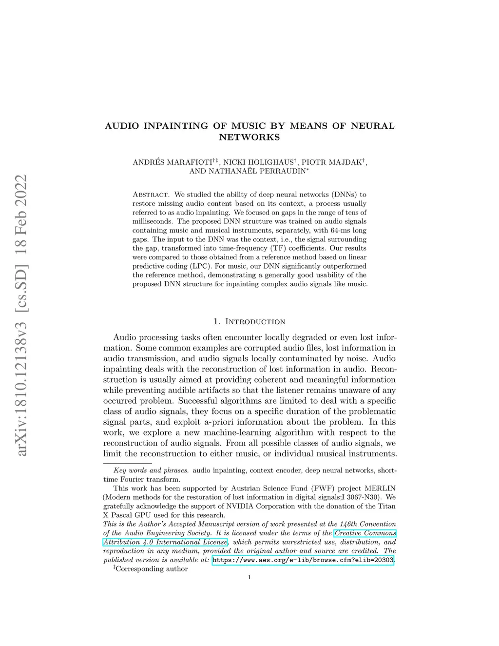 We studied the ability of deep neural networks (DNNs) to restore missing audio content based on its context, a process usually referred to as audio inpainting. We focused on gaps in the range of tens of milliseconds. The proposed DNN structure was trained on audio signals containing music and musical instruments, separately, with 64-ms long gaps. The input to the DNN was the context, i.e., the signal surrounding the gap, transformed into time-frequency (TF) coefficients. Our results were compared to those obtained from a reference method based on linear predictive coding (LPC). For music, our DNN significantly outperformed the reference method, demonstrating a generally good usability of the proposed DNN structure for inpainting complex audio signals like music.