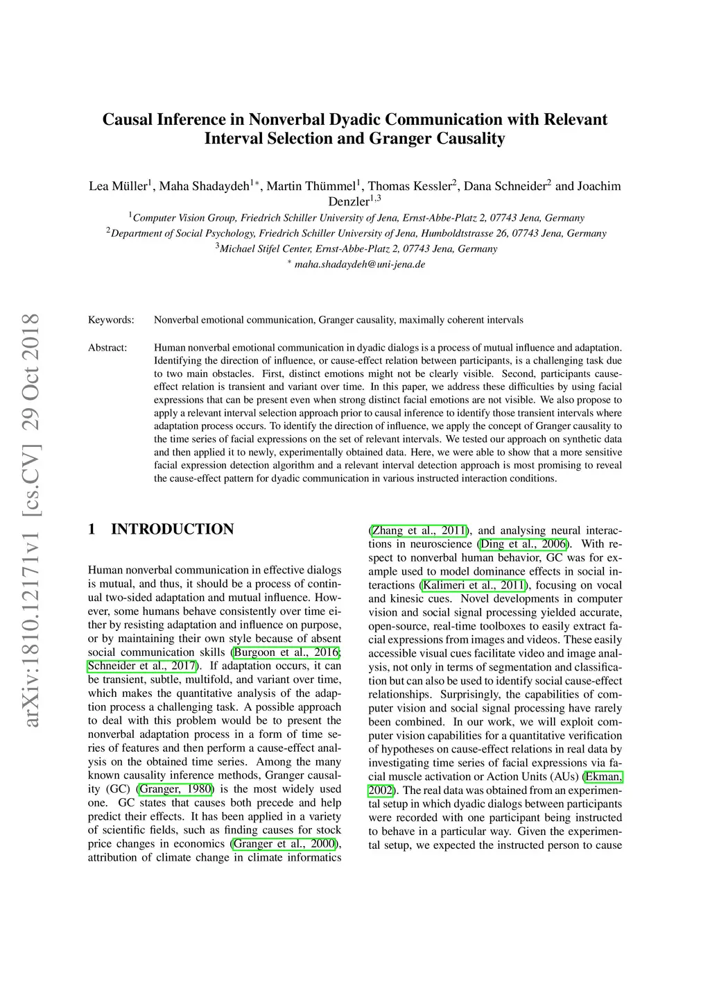 Human nonverbal emotional communication in dyadic dialogs is a process of mutual influence and adaptation. Identifying the direction of influence, or cause-effect relation between participants is a challenging task, due to two main obstacles. First, distinct emotions might not be clearly visible. Second, participants cause-effect relation is transient and variant over time. In this paper, we address these difficulties by using facial expressions that can be present even when strong distinct facial emotions are not visible. We also propose to apply a relevant interval selection approach prior to causal inference to identify those transient intervals where adaptation process occurs. To identify the direction of influence, we apply the concept of Granger causality to the time series of facial expressions on the set of relevant intervals. We tested our approach on synthetic data and then applied it to newly, experimentally obtained data. Here, we were able to show that a more sensitive facial expression detection algorithm and a relevant interval detection approach is most promising to reveal the cause-effect pattern for dyadic communication in various instructed interaction conditions.