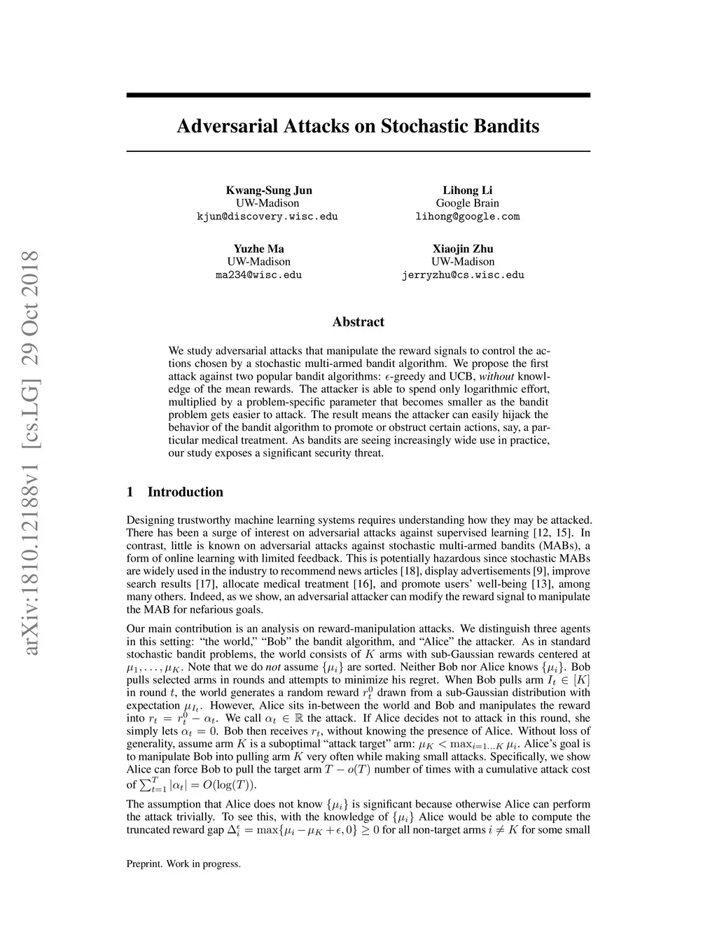 We study adversarial attacks that manipulate the reward signals to control the actions chosen by a stochastic multi-armed bandit algorithm. We propose the first attack against two popular bandit algorithms: -greedy and UCB, \emph{without} knowledge of the mean rewards. The attacker is able to spend only logarithmic effort, multiplied by a problem-specific parameter that becomes smaller as the bandit problem gets easier to attack. The result means the attacker can easily hijack the behavior of the bandit algorithm to promote or obstruct certain actions, say, a particular medical treatment. As bandits are seeing increasingly wide use in practice, our study exposes a significant security threat.