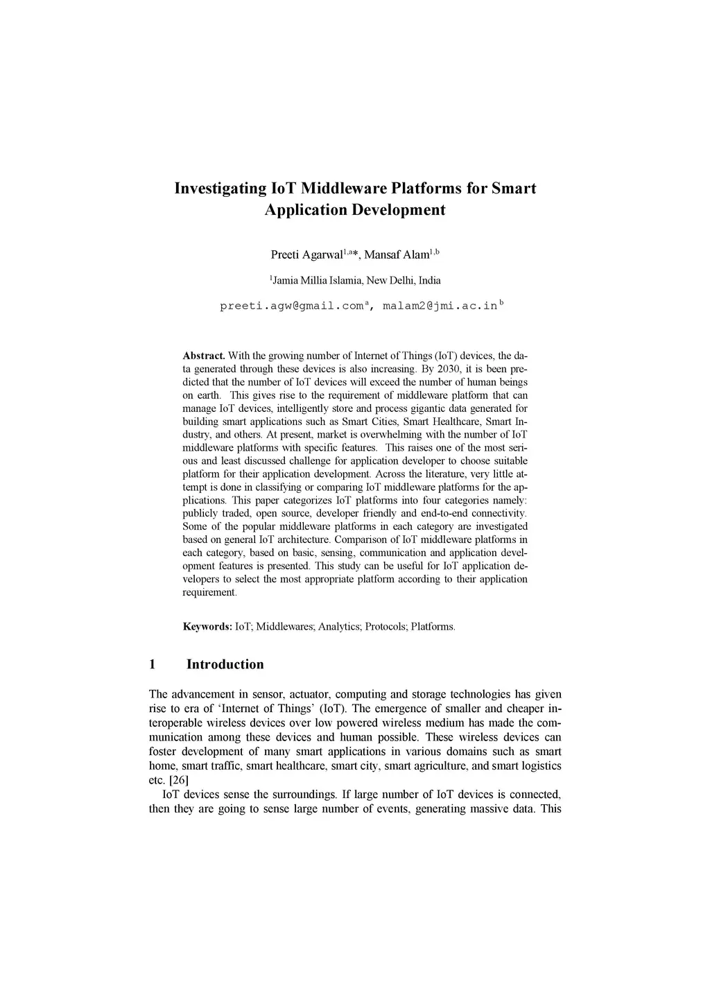 Investigating IoT Middleware Platforms for Smart Application Development